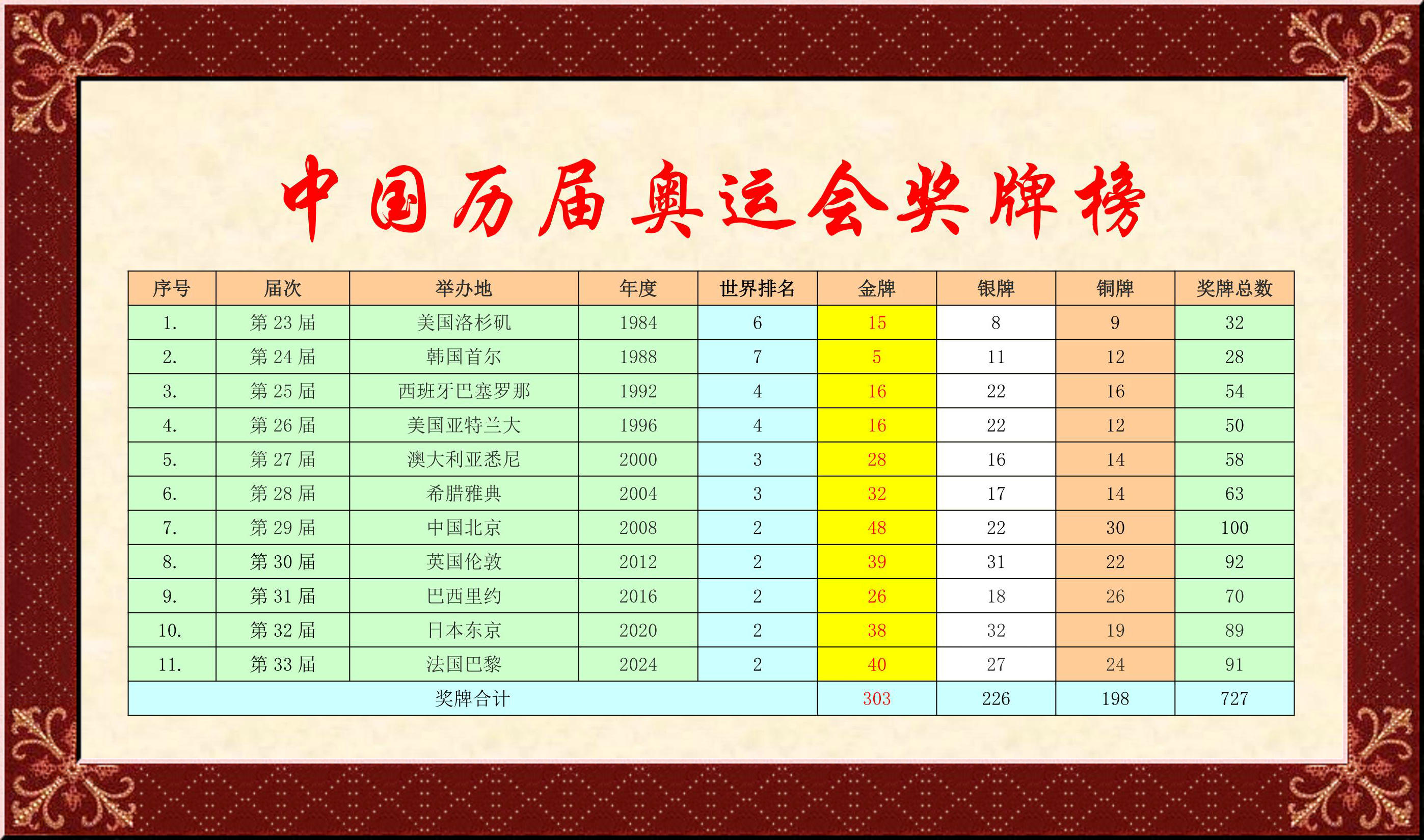 1984年,15金;1988年,5金;1992年,16金;1996年,16金;2000年,28金;2004年,32金;2008年,48金;2012年,39金;2016年,26金;2021年,38金;2024年……