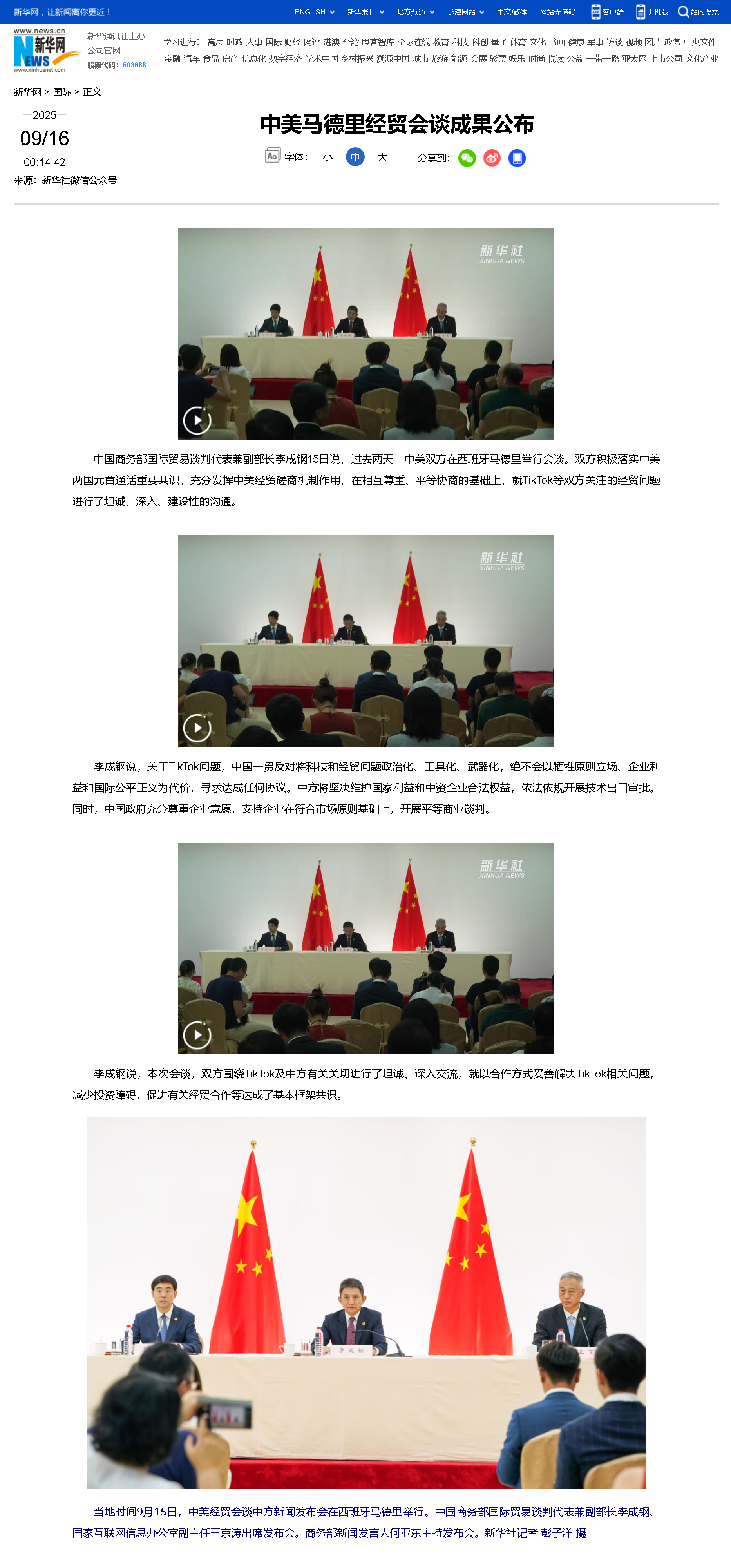 新華社快訊:中國商務部國際貿(mào)易談判代表兼副部長李成鋼15日說,過去兩天,中美雙方在西班牙馬德里舉行會談。雙方積極落實中美兩國元首通話重要共識,充分發(fā)揮中美經(jīng)貿(mào)磋商機制作用,在相互尊重、平等協(xié)商的基礎上,就TikTok等雙方關注的經(jīng)貿(mào)問題進行了坦誠、深入、建設性的溝通。
