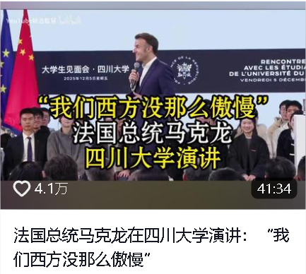 5日下午,馬克龍訪問四川大學(xué)。近年來,四川大學(xué)與法國多所高校建立并深化合作伙伴關(guān)系,該校主要合作伙伴包括法國巴黎政治學(xué)院、巴黎第十大學(xué)、法國圖盧茲大學(xué)和法國國立東方語言文化學(xué)院等,簽署合作協(xié)議近20份。