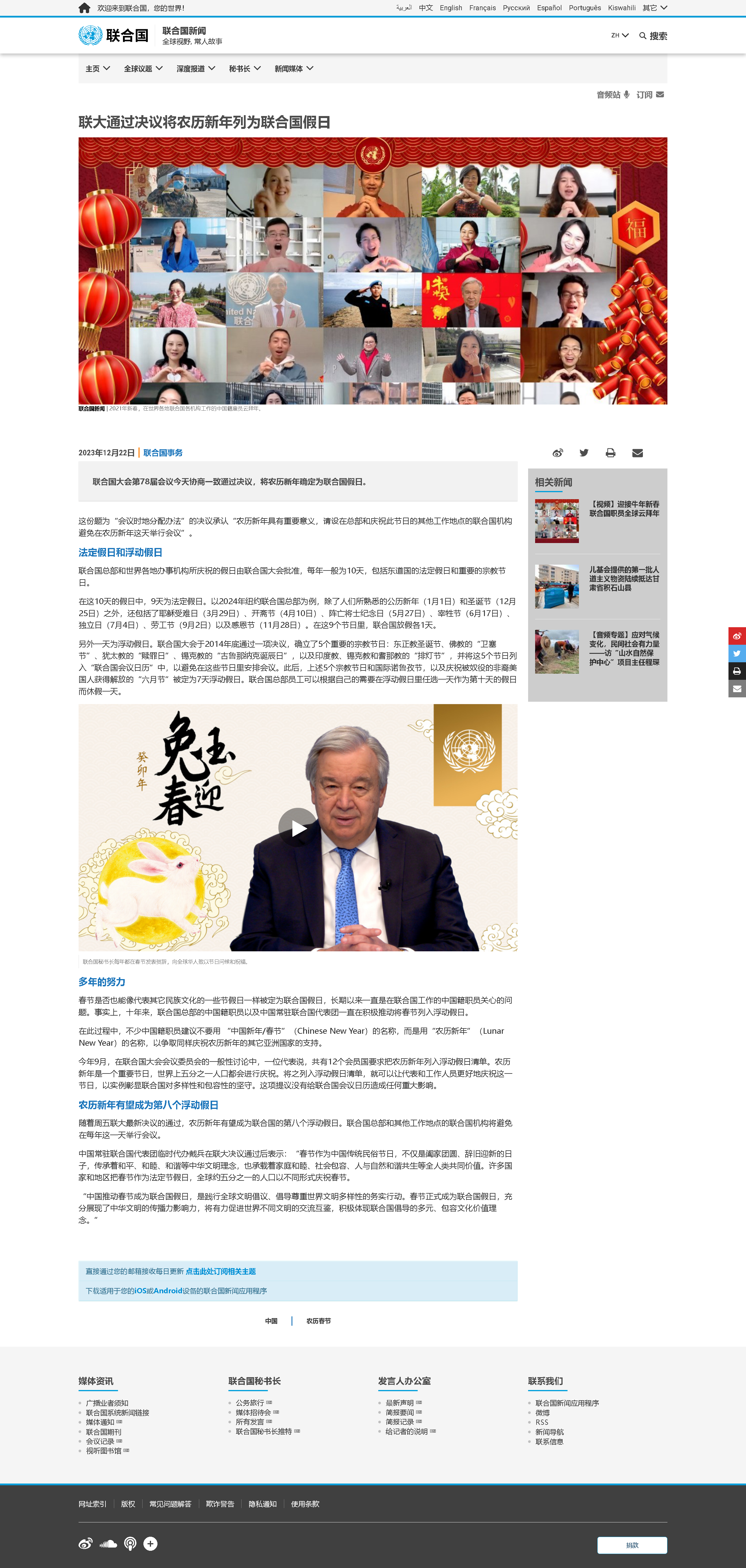 聯(lián)合國除了東道國的重要法定假日外,可由聯(lián)大通過決議,把世界范圍內(nèi)廣泛慶祝的節(jié)日確定為聯(lián)合國假日,在當(dāng)天盡量避免安排會議活動。聯(lián)合國秘書長每年都發(fā)表春節(jié)賀辭,向中國及所有慶祝春節(jié)(農(nóng)歷新年)的各國人民致以節(jié)日問候和祝福。