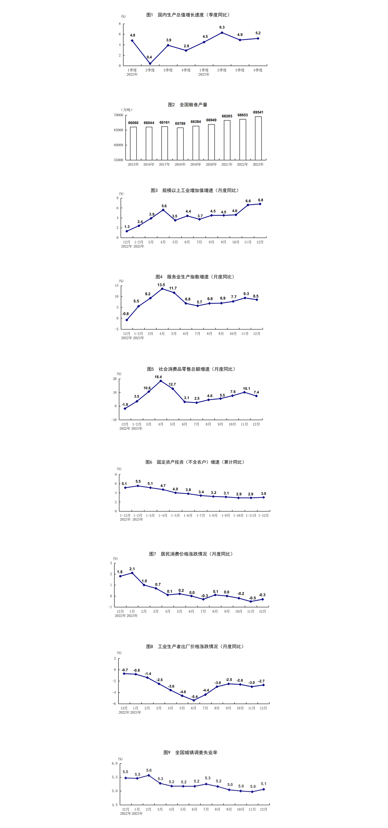 總的來看,2023年我國頂住外部壓力、克服內(nèi)部困難,國民經(jīng)濟(jì)回升向好,高質(zhì)量發(fā)展扎實(shí)推進(jìn),主要預(yù)期目標(biāo)圓滿實(shí)現(xiàn),全面建設(shè)社會(huì)主義現(xiàn)代化國家邁出堅(jiān)實(shí)步伐。同時(shí)也要看到,當(dāng)前外部環(huán)境復(fù)雜性、嚴(yán)峻性、不確定性上升,經(jīng)濟(jì)發(fā)展仍面臨一些困難和挑戰(zhàn)。下階段,要堅(jiān)持以習(xí)近平新時(shí)代中國特色社會(huì)主義思想為指導(dǎo),全面貫徹落實(shí)黨的二十大和二十屆二中全會(huì)精神,按照中央經(jīng)濟(jì)工作會(huì)議部署,完整、準(zhǔn)確、全面貫徹新發(fā)展理念,加快構(gòu)建新發(fā)展格局,聚焦高質(zhì)量發(fā)展這一首要任務(wù),堅(jiān)持穩(wěn)中求進(jìn)、以進(jìn)促穩(wěn)、先立后破,加大宏觀調(diào)控力度,統(tǒng)籌擴(kuò)大內(nèi)需和深化供給側(cè)結(jié)構(gòu)性改革,統(tǒng)籌新型城鎮(zhèn)化和鄉(xiāng)村全面振興,統(tǒng)籌高質(zhì)量發(fā)展和高水平安全,切實(shí)增強(qiáng)經(jīng)濟(jì)活力、防范化解風(fēng)險(xiǎn)、改善社會(huì)預(yù)期,鞏固和增強(qiáng)經(jīng)濟(jì)回升向好態(tài)勢(shì),持續(xù)推動(dòng)經(jīng)濟(jì)實(shí)現(xiàn)質(zhì)的有效提升和量的合理增長(zhǎng)。