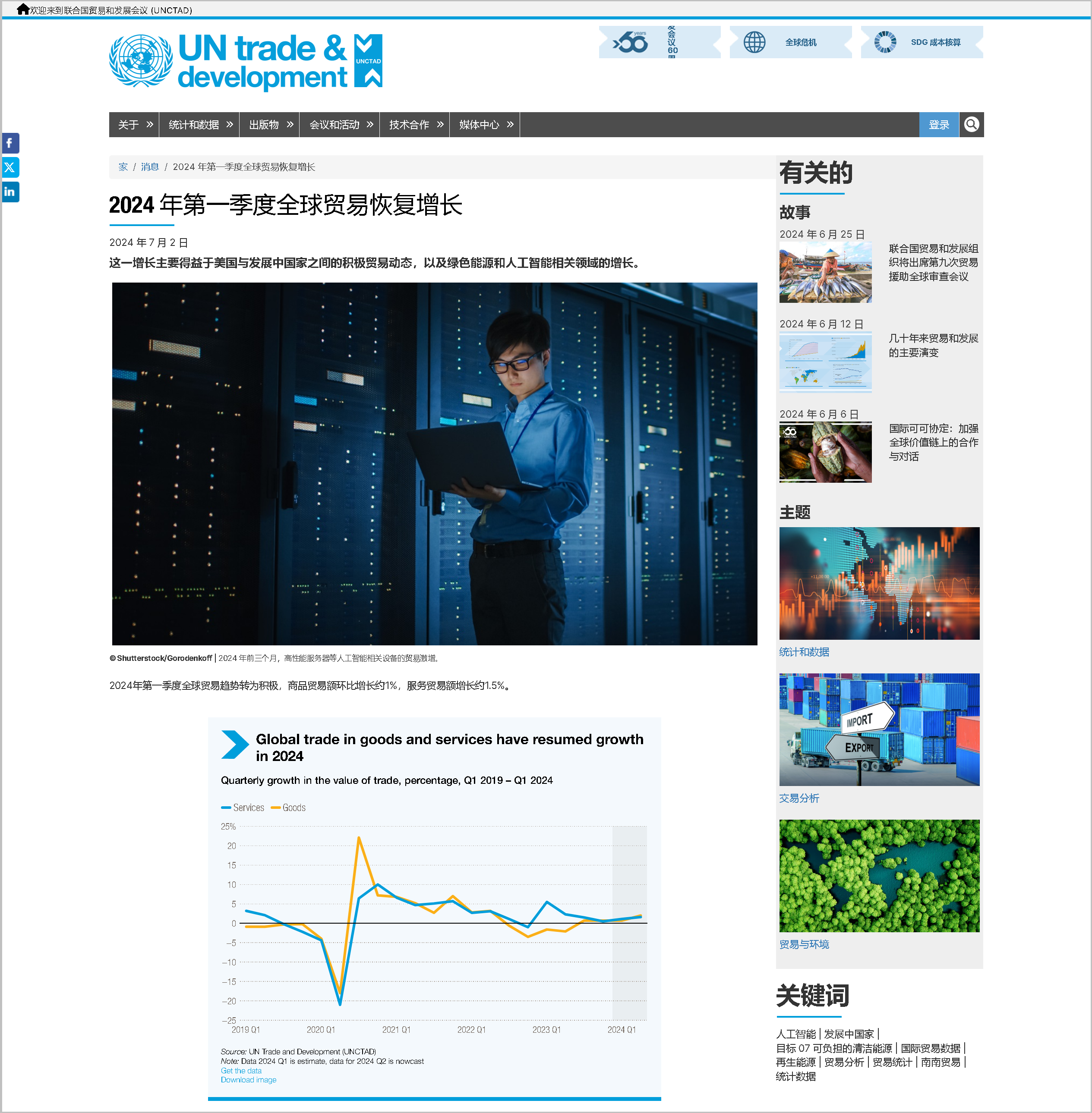 新華社日內瓦7月3日電(記者 陳斌杰)聯合國貿易和發(fā)展會議(貿發(fā)會議)2日發(fā)布的報告顯示,2024年第一季度全球貿易趨勢轉好,貨物貿易額環(huán)比增長約1%,服務貿易額環(huán)比增長約1.5%。