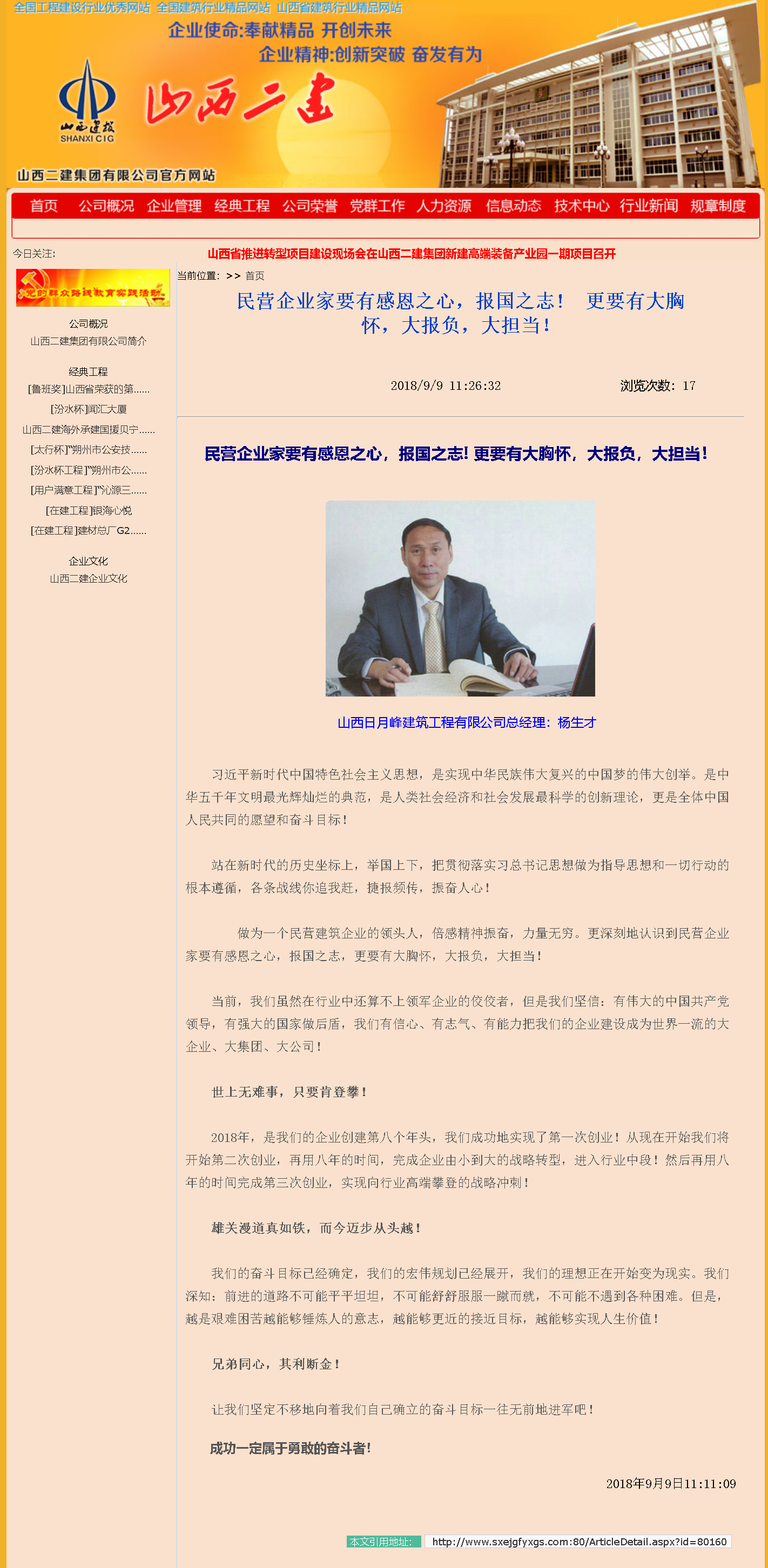 做為一個(gè)民營建筑企業(yè)的領(lǐng)頭人,倍感精神振奮,力量無窮。更深刻地認(rèn)識(shí)到民營企業(yè)家要有感恩之心,報(bào)國之志,更要有大胸懷,大報(bào)負(fù),大擔(dān)當(dāng)!