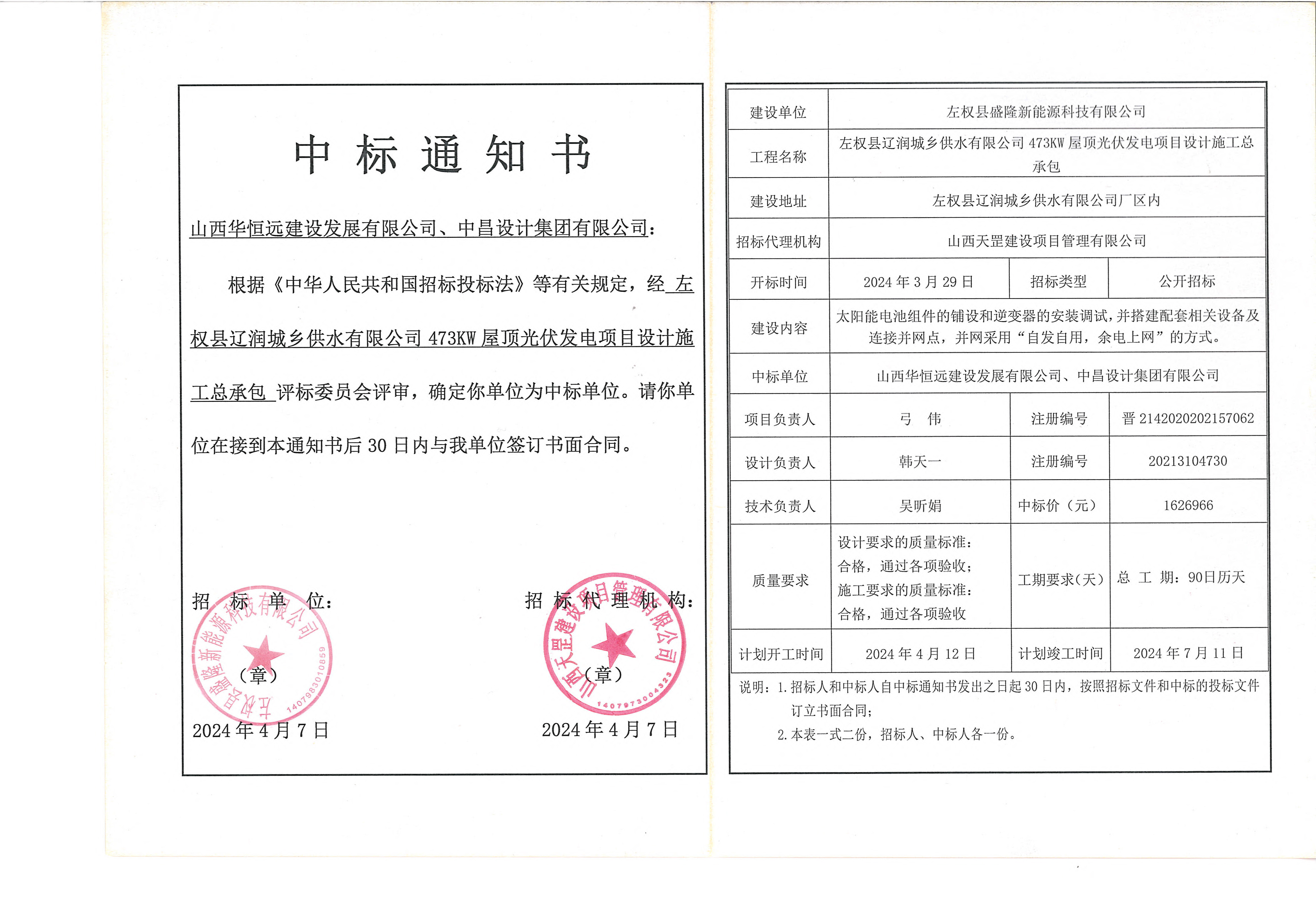 左權縣遼闊城鄉(xiāng)供水有限公司473KW屋頂光伏發(fā)電項目設計施工總承包合同