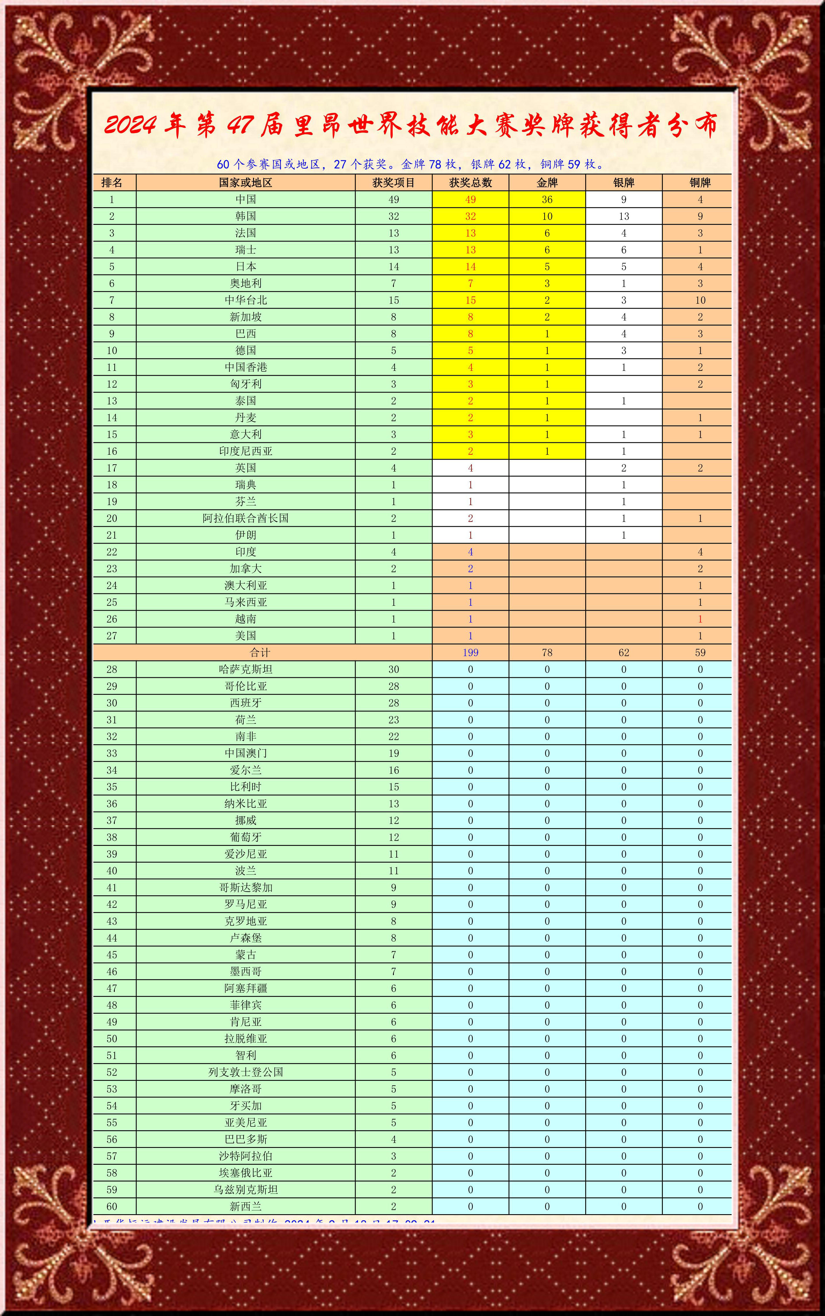 第47屆世界技能大賽日前在法國(guó)里昂閉幕,中國(guó)代表團(tuán)在本次大賽中表現(xiàn)出色,在全部59個(gè)項(xiàng)目中,共獲得36枚金牌、9枚銀牌、4枚銅牌和8個(gè)優(yōu)勝獎(jiǎng),位居金牌榜、獎(jiǎng)牌榜和團(tuán)體總分首位。這是我國(guó)參賽項(xiàng)目、參賽選手最多的一屆大賽,參賽選手絕大部分為“00后”技能小將,凸顯出我國(guó)技能人才梯隊(duì)建設(shè)取得顯著成效。