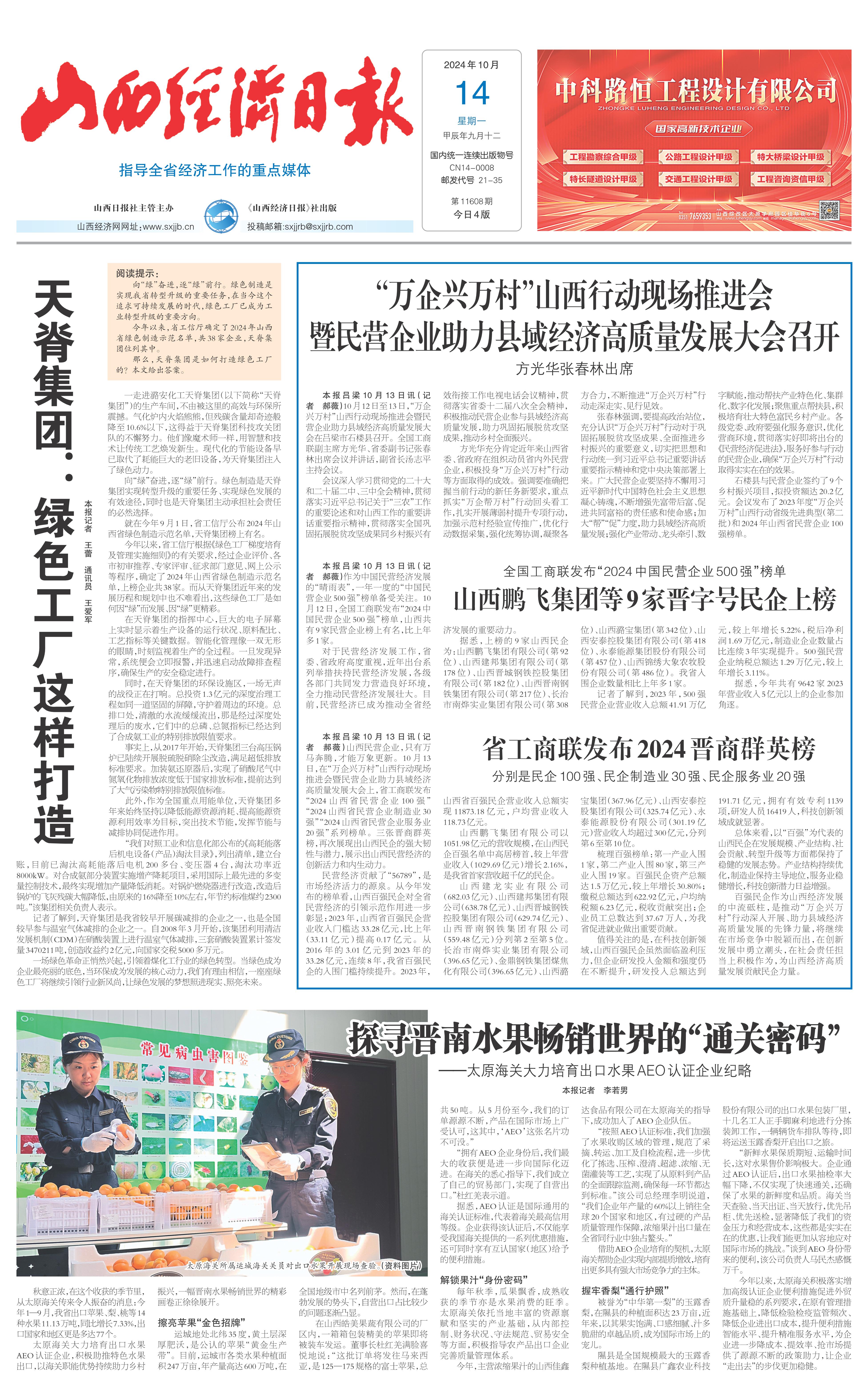 本報(bào)呂梁10月13日訊(記者 郝薇)山西民營(yíng)企業(yè),只有萬(wàn)馬奔騰,才能萬(wàn)象更新。10月13日,在“萬(wàn)企興萬(wàn)村”山西行動(dòng)現(xiàn)場(chǎng)推進(jìn)會(huì)暨民營(yíng)企業(yè)助力縣域經(jīng)濟(jì)高質(zhì)量發(fā)展大會(huì)上,省工商聯(lián)發(fā)布“2024山西省民營(yíng)企業(yè)100強(qiáng)”“2024山西省民營(yíng)企業(yè)制造業(yè)30強(qiáng)”“2024山西省民營(yíng)企業(yè)服務(wù)業(yè)20強(qiáng)”系列榜單。三張晉商群英榜,再次展現(xiàn)出山西民企的強(qiáng)大韌性與潛力,展示出山西民營(yíng)經(jīng)濟(jì)的創(chuàng)新活力和內(nèi)生動(dòng)力。