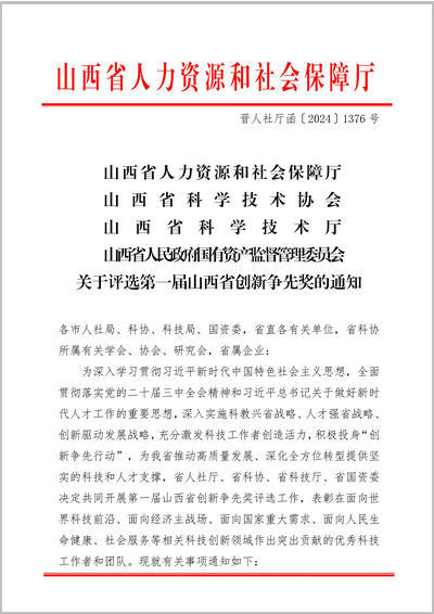 近日,省人社廳、省科協(xié)、省科技廳、省國資委聯(lián)合下發(fā)通知,決定共同開展第一屆山西省創(chuàng)新爭先獎評選工作,以表彰在面向世界科技前沿、面向經(jīng)濟(jì)主戰(zhàn)場等相關(guān)科技創(chuàng)新領(lǐng)域作出突出貢獻(xiàn)的優(yōu)秀科技工作者和團(tuán)隊。