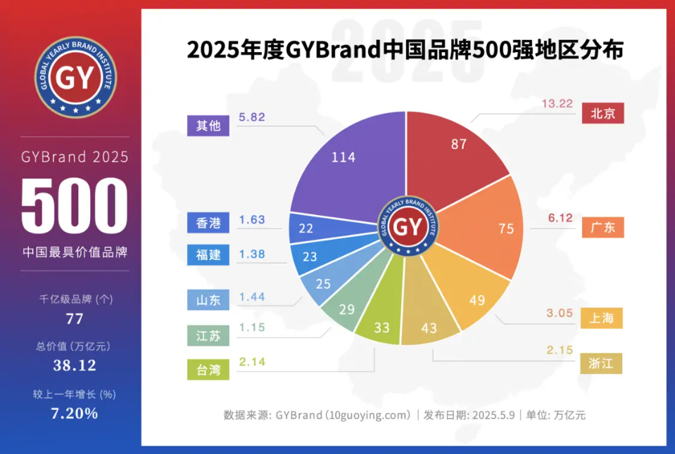 GYBrand近日發(fā)布的2025年中國最具價值品牌500榜單顯示(查看報告詳情>>),今年上榜的500個品牌總價值為38.12萬億人民幣,同比增長7.20%,共有77家企業(yè)的品牌價值達到千億級別。前十名單中,北京占據(jù)6個,廣東占了2個,香港和貴州各占1個,TOP10品牌總價值高達5.47萬億人民幣,占了500強品牌總價值的14.35%。