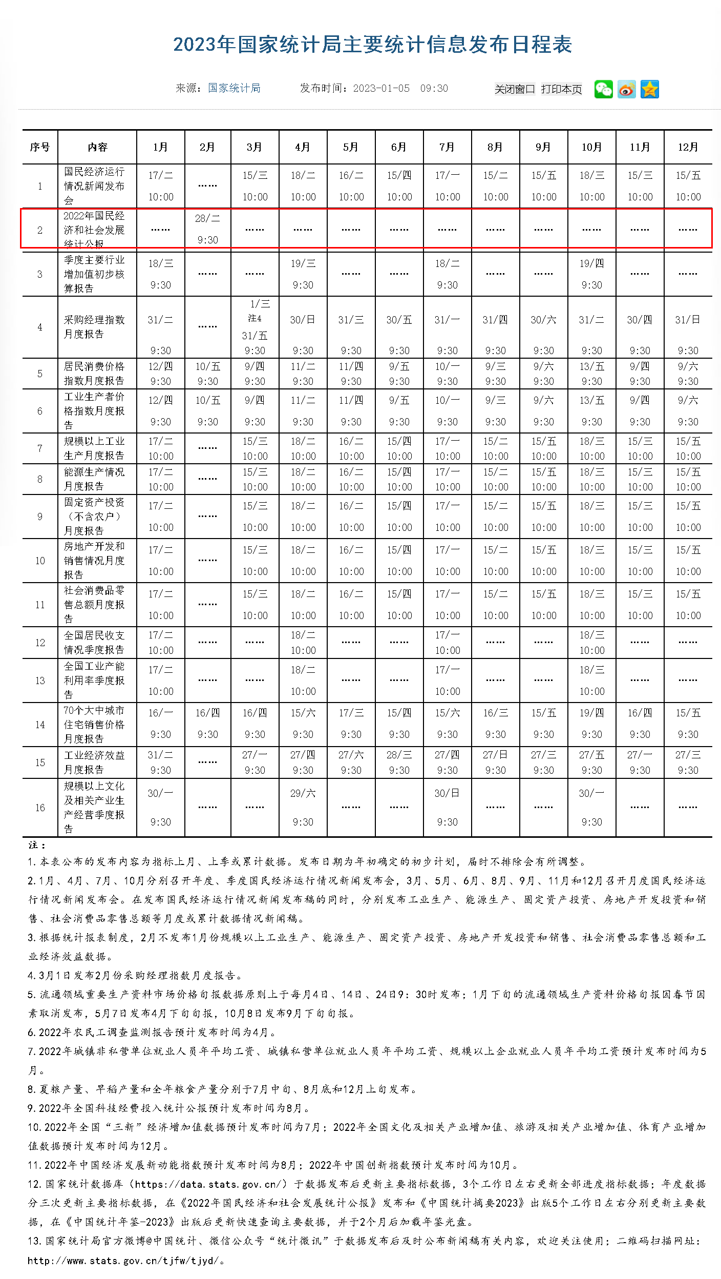 2023年國家統(tǒng)計局主要統(tǒng)計信息發(fā)布日程表