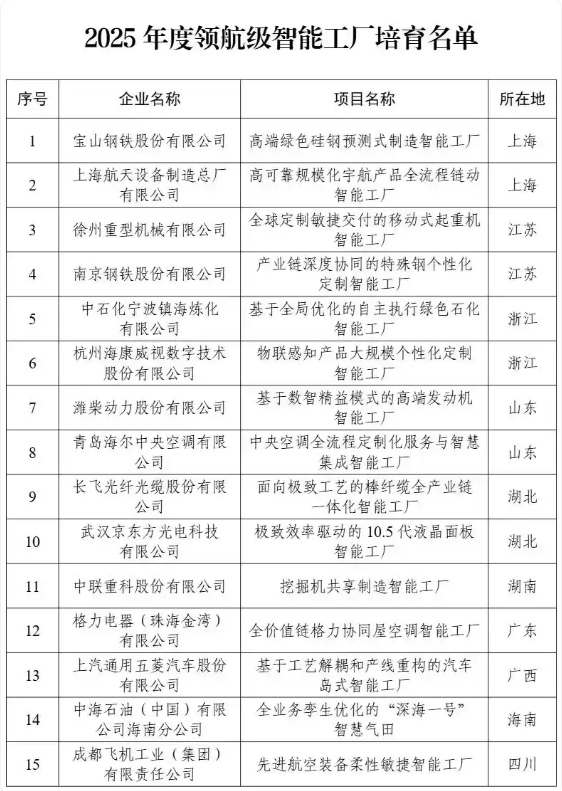 工信部等六部門11月27日正式公布首批15家領(lǐng)航級智能工廠名單,其中涵蓋裝備制造、原材料、電子信息、消費品等多個關(guān)鍵行業(yè)。