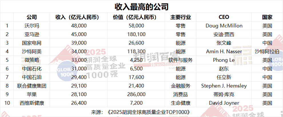 沃爾瑪?shù)哪晔杖胱罡?,達(dá)4.8萬(wàn)億元人民幣,其次是亞馬遜(4.5萬(wàn)億元人民幣)和中國(guó)國(guó)家電網(wǎng)(3.9萬(wàn)億元人民幣)