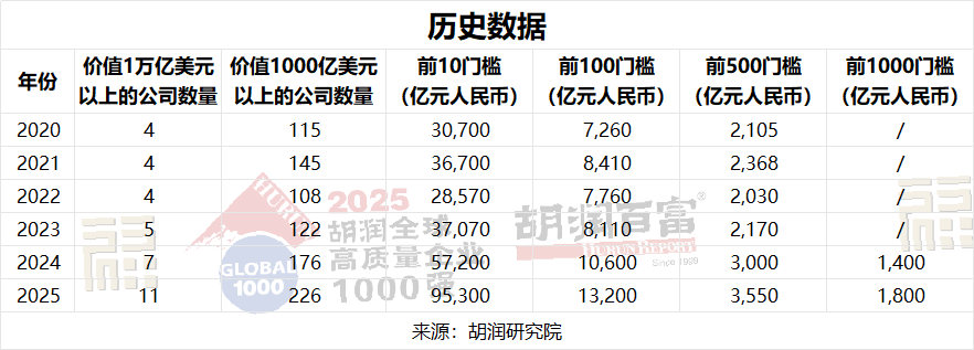 自2024年起,胡潤(rùn)研究院將全球最具價(jià)值公司榜單從500強(qiáng)擴(kuò)展至1000強(qiáng),并將國(guó)有企業(yè)納入其中。