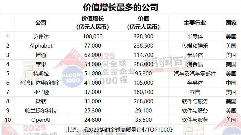 2025年胡潤(rùn)全球高質(zhì)量企業(yè)前十名由美國(guó)科技巨頭主導(dǎo),英偉達(dá)排名上升兩位,在人工智能芯片空前需求的推動(dòng)下,其價(jià)值上漲49%,達(dá)到32.8萬(wàn)億元人民幣。蘋(píng)果繼續(xù)受益于強(qiáng)勁的設(shè)備和服務(wù)收入,以28.6萬(wàn)億元人民幣保持第二位,而微軟下滑兩位至第三位,盡管在堅(jiān)實(shí)的云業(yè)務(wù)和企業(yè)業(yè)務(wù)的支撐下增長(zhǎng)了13%,達(dá)到26.9萬(wàn)億元人民幣。Alphabet排名第四,增長(zhǎng)48%至23.9萬(wàn)億元人民幣,得益于人工智能的快速應(yīng)用和廣告業(yè)務(wù)的支撐,亞馬遜排名第五,價(jià)值18萬(wàn)億元人民幣,在電商業(yè)務(wù)改善和AWS增長(zhǎng)的推動(dòng)下,亞馬遜穩(wěn)步增長(zhǎng)26%。