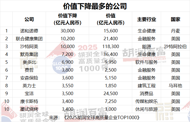 價(jià)值下降最多的上榜企業(yè)是諾和諾德,減少了3萬(wàn)億元人民幣,至1.6萬(wàn)億元人民幣,反映出該公司減肥藥組合歷經(jīng)多年高速增長(zhǎng)后,投資者情緒有所回落。聯(lián)合健康集團(tuán)的價(jià)值下降了1萬(wàn)億元人民幣,至2.1萬(wàn)億元人民幣,受到監(jiān)管審查和醫(yī)療成本壓力上升的影響。沙特阿美價(jià)值下降了1萬(wàn)億元人民幣,至11.8萬(wàn)億元人民幣,原因是油價(jià)走軟和能源行業(yè)市盈率走弱。奧多比下跌6900億元人民幣至9950億元人民幣,原因是人工智能驅(qū)動(dòng)的創(chuàng)意軟件面臨競(jìng)爭(zhēng)壓力。