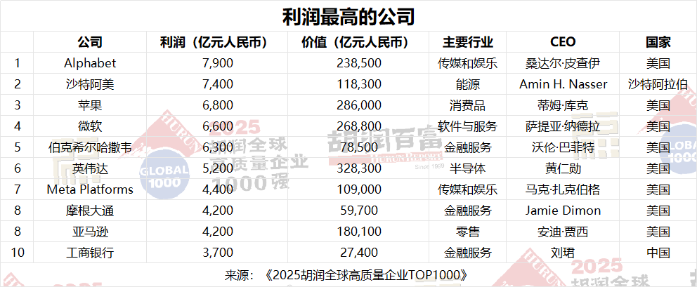 Alphabet的利潤(rùn)最高,達(dá)7900億元人民幣,其次是沙特阿美(7400億元人民幣)和蘋(píng)果(6800億元人民幣)
