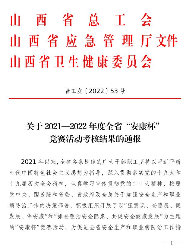 在2021-2022年“安康杯”競賽活動中,一大批先進集體和優(yōu)秀個人脫穎而出,為促進全省安全生產(chǎn)和職業(yè)病防治工作持續(xù)穩(wěn)步好轉(zhuǎn)作出了積極貢獻。為激勵先進、樹立典型,進一步調(diào)動廣大職工干事創(chuàng)業(yè)的積極性,省總工會、省應急管理廳和省衛(wèi)生健康委員會決定對山西焦煤西山煤電集團有限責任公司東曲礦等10個 “安全明星企業(yè)”、國家能源集團神東煤炭集團保德煤礦大學生智能化采煤班等10個“安全示范班組”、長治市潞城區(qū)應急管理局安全公益宣教基地安全志愿者宋衛(wèi)國等10名“安全衛(wèi)士”以及太原西北二環(huán)高速公路發(fā)展有限公司等88個“優(yōu)勝單位”、山西金蘭化工股份有限公司包裝車間甲班等50個“優(yōu)勝班組”、中國定武集團工會干事安靜等60名“安全標兵”、華新燃氣集團有限公司等30個“優(yōu)秀組織單位”進行通報表揚。