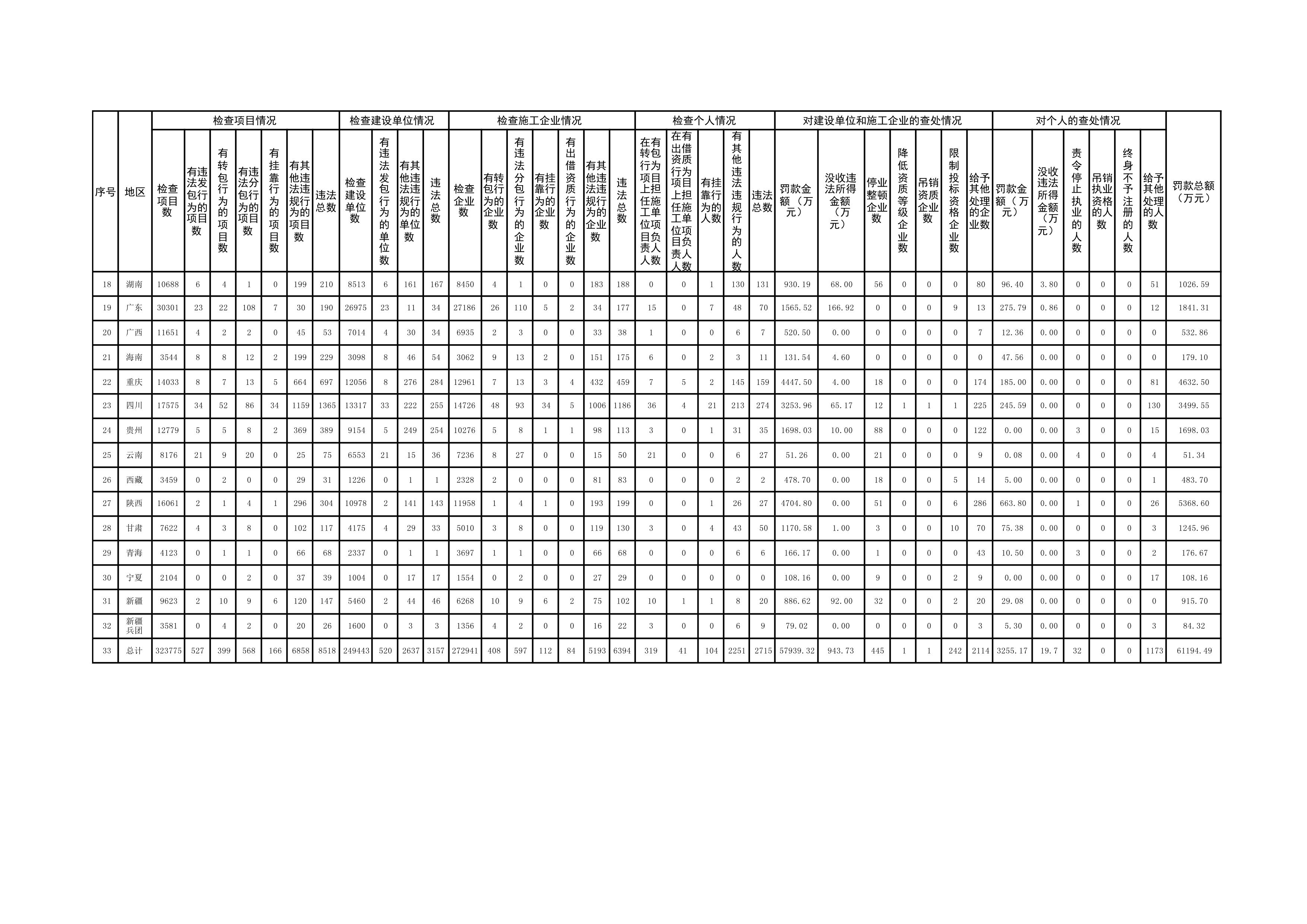 各地住房和城鄉(xiāng)建設(shè)主管部門對(duì)存在違法違規(guī)行為的企業(yè)和人員,分別采取停業(yè)整頓、降低資質(zhì)等級(jí)、吊銷資質(zhì)、責(zé)令停止執(zhí)業(yè)、通報(bào)批評(píng)、沒收違法所得、罰款、信用懲戒等行政處罰或行政管理措施。其中,責(zé)令停業(yè)整頓的企業(yè)445家,降低資質(zhì)等級(jí)的企業(yè)1家,吊銷資質(zhì)的企業(yè)1家,限制投標(biāo)資格的企業(yè)242家,給予通報(bào)批評(píng)、信用懲戒等處理的企業(yè)2114家;責(zé)令停止執(zhí)業(yè)32人,給予通報(bào)批評(píng)等處理1173人;沒收違法所得總額963.43萬元(含個(gè)人違法所得19.7萬元),罰款總額61194.49萬元(含個(gè)人罰款3255.17萬元)。