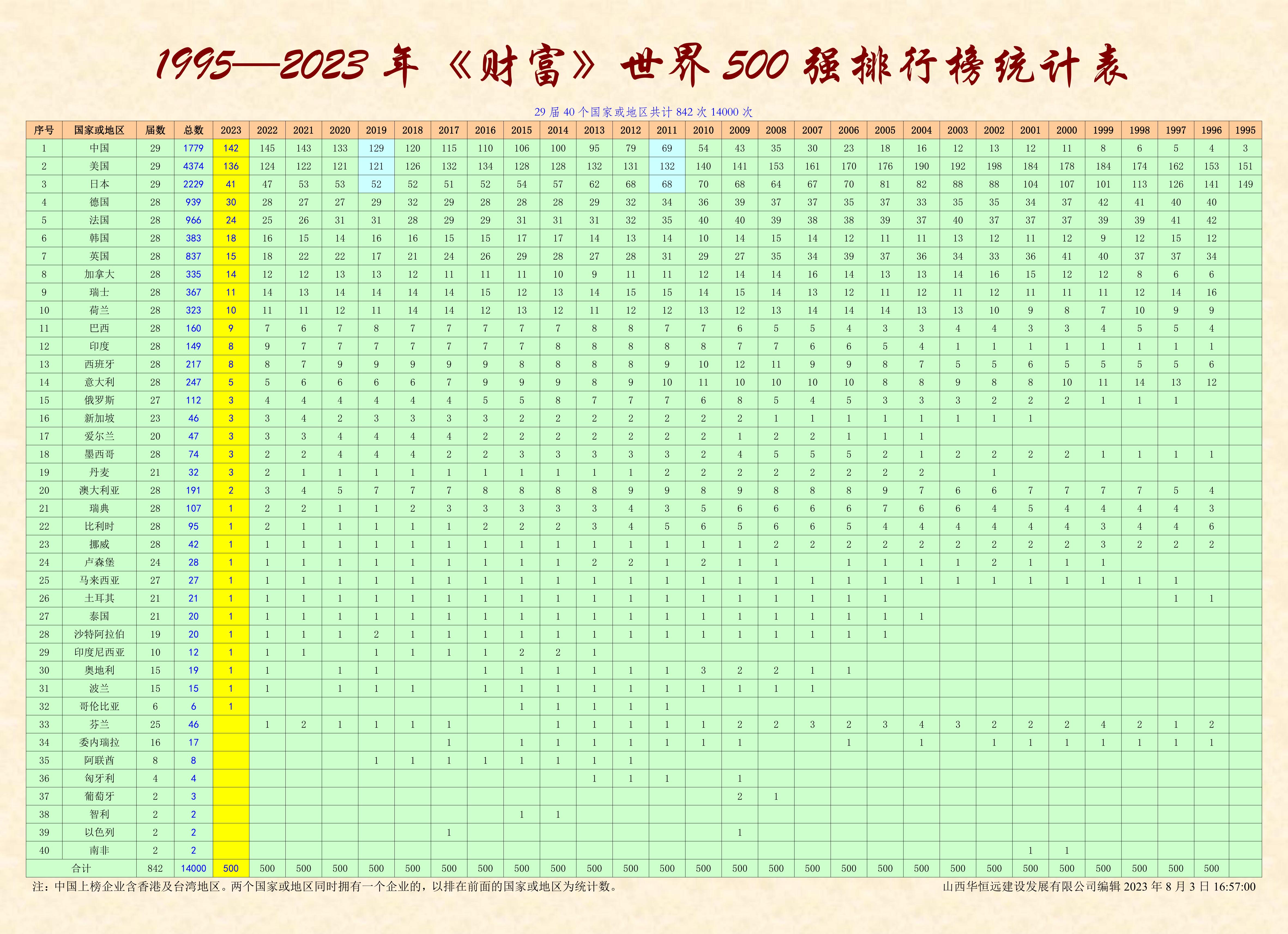 1995年,《財富》雜志首次公布世界500強企業(yè)。日本有149家,美國有151家,占世界500強企業(yè)的近30%。當(dāng)時,世界500強企業(yè)中只有3家在中國。