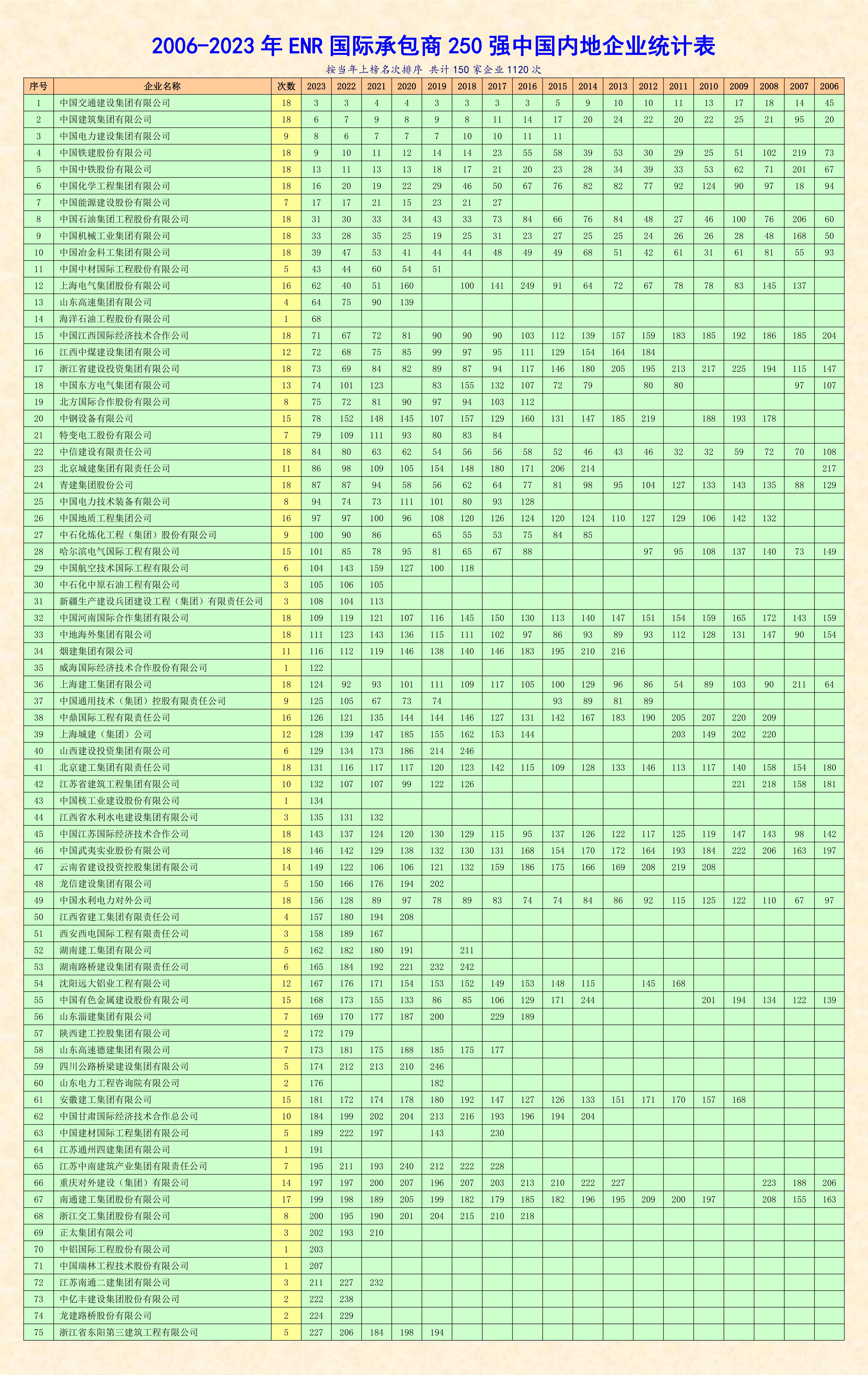據(jù)悉,美國《工程新聞紀錄》(ENR)雜志是全球工程建設(shè)領(lǐng)域最權(quán)威的學(xué)術(shù)雜志,其每年發(fā)布的“全球承包商250強”和“國際承包商250強”榜單被譽為國際工程界的“晴雨表”,是建筑行業(yè)公認的、較為全面反映年度全球建筑市場發(fā)展狀況的權(quán)威排名。其中,全球榜單根據(jù)企業(yè)的整體營業(yè)額進行排名,反映了企業(yè)的整體營業(yè)能力。國際榜單根據(jù)企業(yè)海外業(yè)務(wù)營業(yè)額,即本國以外的國際市場完成的營業(yè)額進行排名,反映了企業(yè)在國際市場上的競爭力。