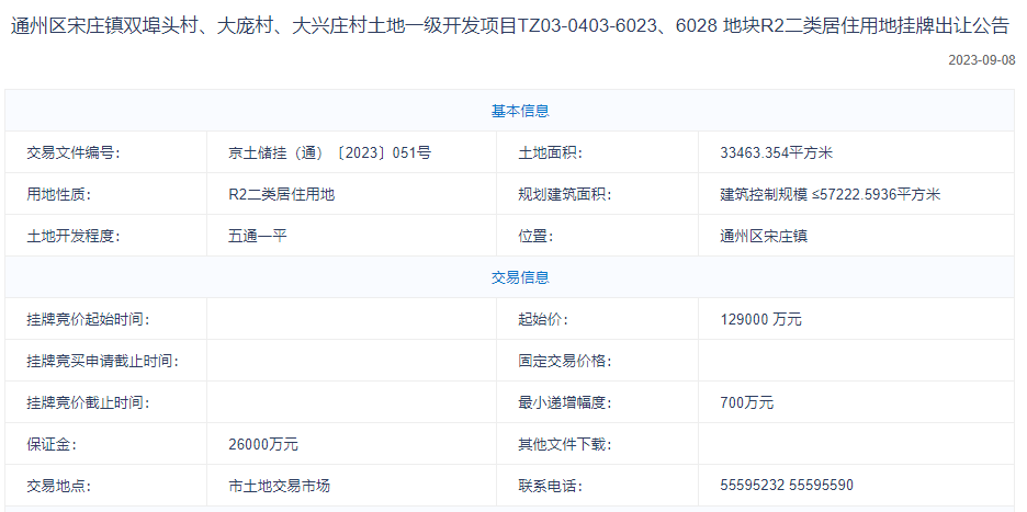 公開資料顯示,該宗地為通州區(qū)宋莊鎮(zhèn)雙埠頭村、大龐村、大興莊村土地一級開發(fā)項目TZ03-0403-6023、6028地塊,用地性質為R2二類居住用地,位于北京市通州區(qū)宋莊鎮(zhèn),四至范圍為:宋莊鎮(zhèn)小堡藝術區(qū)北側,東至徐宋路,西至規(guī)劃道路,南至規(guī)劃防護綠地用地,北至規(guī)劃道路,土地面積約33463.354平方米,建筑控制規(guī)模約57222.5936平方米。交易起始價12.9億元。