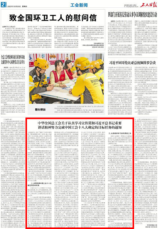 2023年10月9日至12日召開(kāi)的中國(guó)工會(huì)第十八次全國(guó)代表大會(huì),是在我國(guó)邁上全面建設(shè)社會(huì)主義現(xiàn)代化國(guó)家新征程、向第二個(gè)百年奮斗目標(biāo)進(jìn)軍的關(guān)鍵時(shí)刻召開(kāi)的一次十分重要的大會(huì),是全國(guó)廣大工會(huì)工作者和億萬(wàn)職工群眾政治生活中的一件大事。以習(xí)近平同志為核心的黨中央高度重視中國(guó)工會(huì)十八大,習(xí)近平總書記等黨和國(guó)家領(lǐng)導(dǎo)人出席大會(huì)開(kāi)幕式,中共中央政治局常委、中央書記處書記蔡奇代表黨中央向大會(huì)作了題為《奮力書寫我國(guó)工人階級(jí)投身強(qiáng)國(guó)建設(shè)民族復(fù)興的壯麗篇章》的致詞;大會(huì)閉幕后,10月23日,習(xí)近平總書記同中華全國(guó)總工會(huì)新一屆領(lǐng)導(dǎo)班子成員集體談話并發(fā)表重要講話,高度評(píng)價(jià)黨的十八大以來(lái)我國(guó)工人階級(jí)在黨和國(guó)家事業(yè)發(fā)展中作出的重大貢獻(xiàn),充分肯定新時(shí)代工運(yùn)事業(yè)取得歷史性成就、工會(huì)工作實(shí)現(xiàn)全方位進(jìn)步,對(duì)做好今后一個(gè)時(shí)期的工會(huì)工作提出明確要求。這些充分體現(xiàn)了黨中央對(duì)工人階級(jí)和工會(huì)工作的高度重視,是對(duì)全國(guó)廣大工會(huì)工作者和億萬(wàn)職工群眾的親切關(guān)懷和巨大鼓舞。認(rèn)真學(xué)習(xí)宣傳貫徹習(xí)近平總書記重要講話精神、努力完成中國(guó)工會(huì)十八大確定的目標(biāo)任務(wù),是當(dāng)前和今后一個(gè)時(shí)期各級(jí)工會(huì)的重大政治任務(wù)?,F(xiàn)就做好學(xué)習(xí)宣傳貫徹工作通知如下。