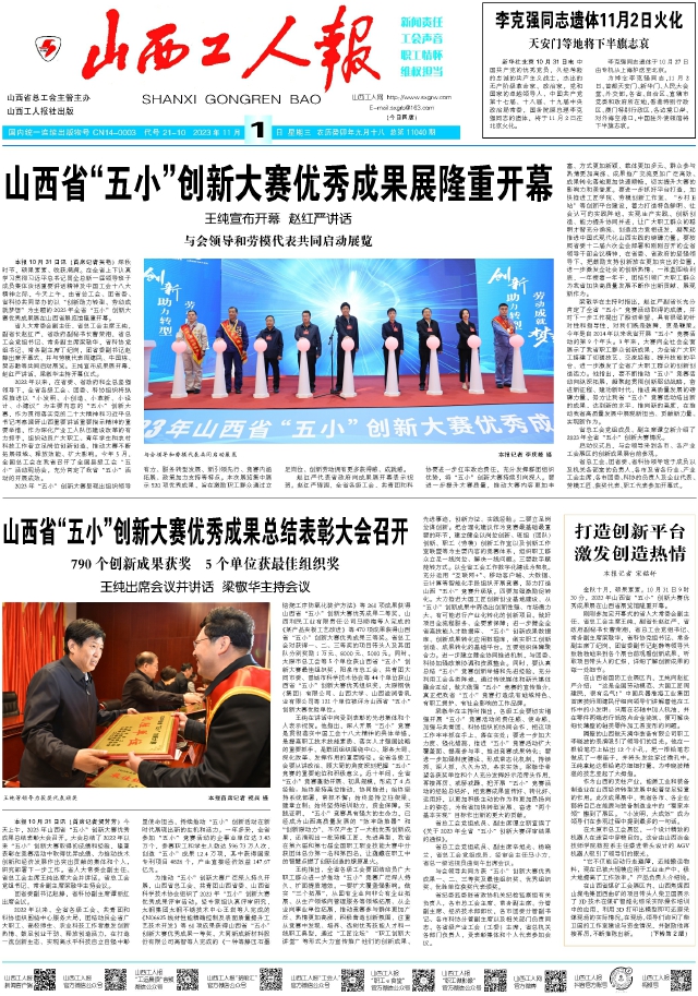 2022年以來,在省委、省政府和全總堅(jiān)強(qiáng)領(lǐng)導(dǎo)下,全省各級工會(huì)、團(tuán)委、科協(xié)組織將縱深推進(jìn)以“小發(fā)明、小創(chuàng)造、小革新、小設(shè)計(jì)、小建議”為主要內(nèi)容的“五小”創(chuàng)新大賽,作為貫徹落實(shí)黨的二十大精神和習(xí)近平總書記考察調(diào)研山西重要講話重要指示精神的重要舉措,作為深化產(chǎn)業(yè)工人隊(duì)伍建設(shè)改革的有力抓手,組織動(dòng)員廣大職工、青年學(xué)生和農(nóng)村科技工作者立足崗位創(chuàng)新創(chuàng)造,推動(dòng)大賽不斷拓展領(lǐng)域、釋放效能、擴(kuò)大影響。今年5月,全國總工會(huì)在我省召開了全國縣級工會(huì)“五小”活動(dòng)現(xiàn)場會(huì),充分肯定了我省“五小”活動(dòng)的開展成效。