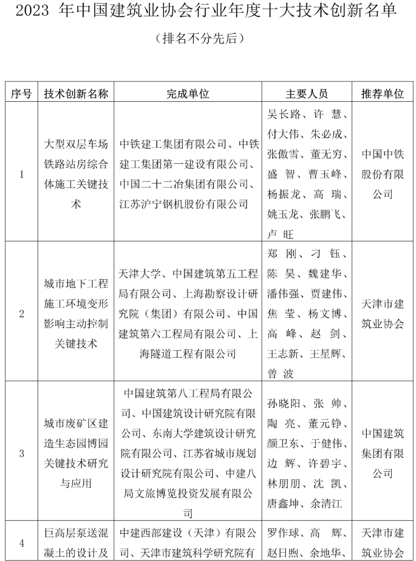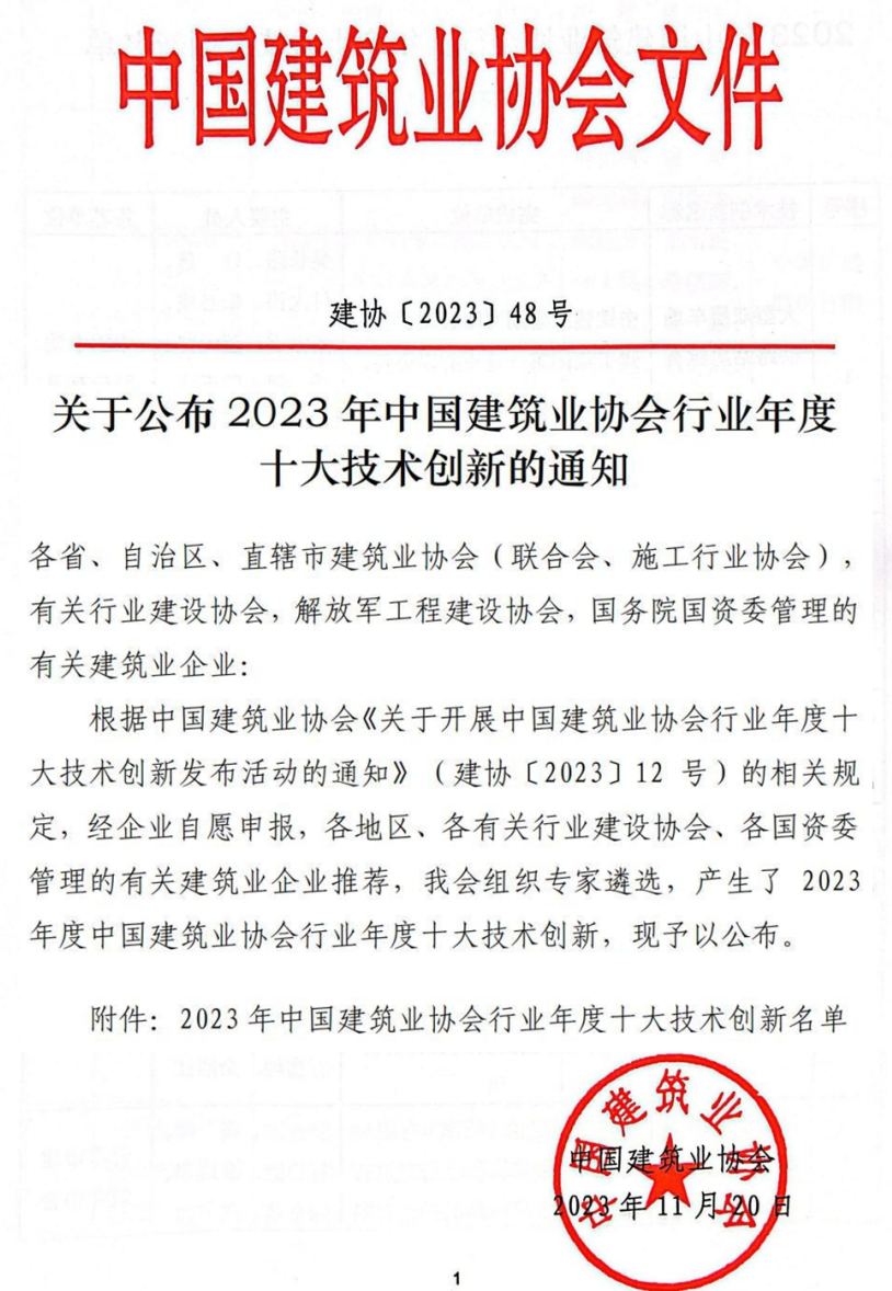 關(guān)于公布2023年中國建筑業(yè)協(xié)會(huì)行業(yè)年度十大技術(shù)創(chuàng)新的通知