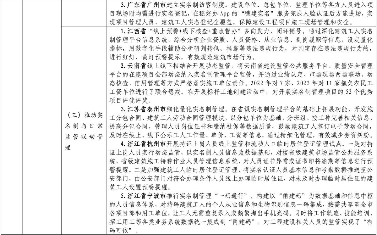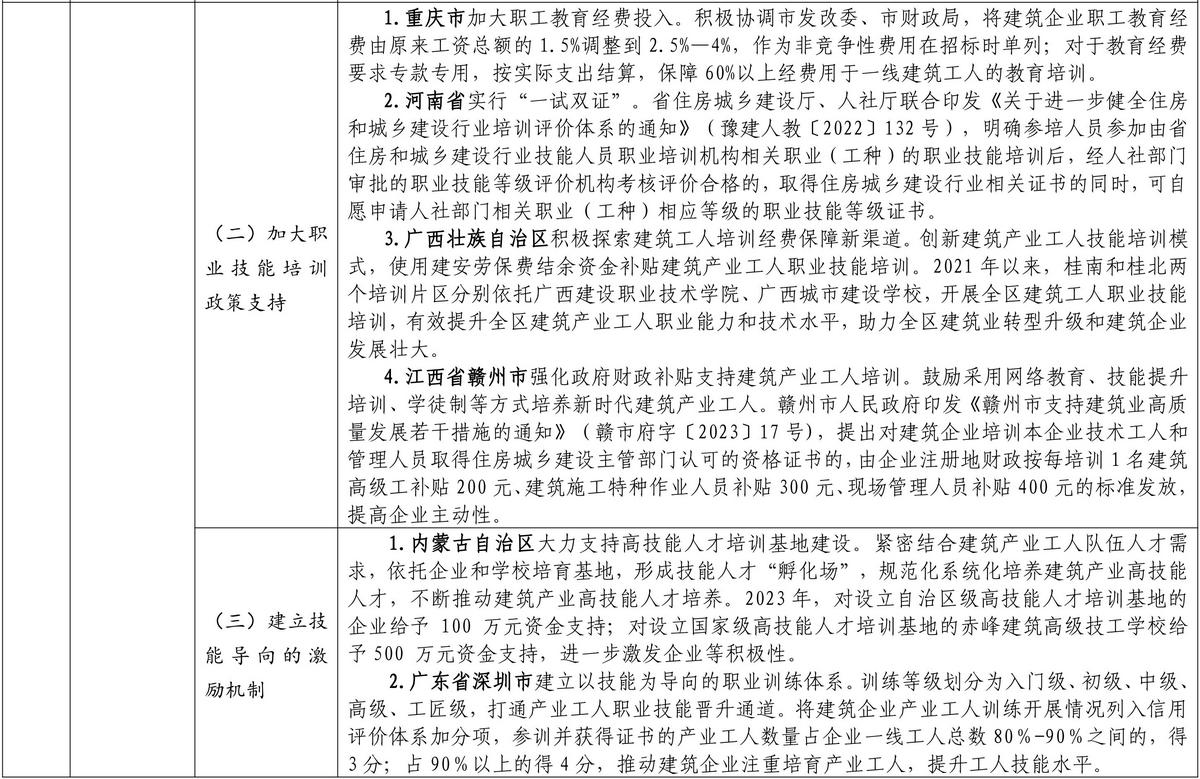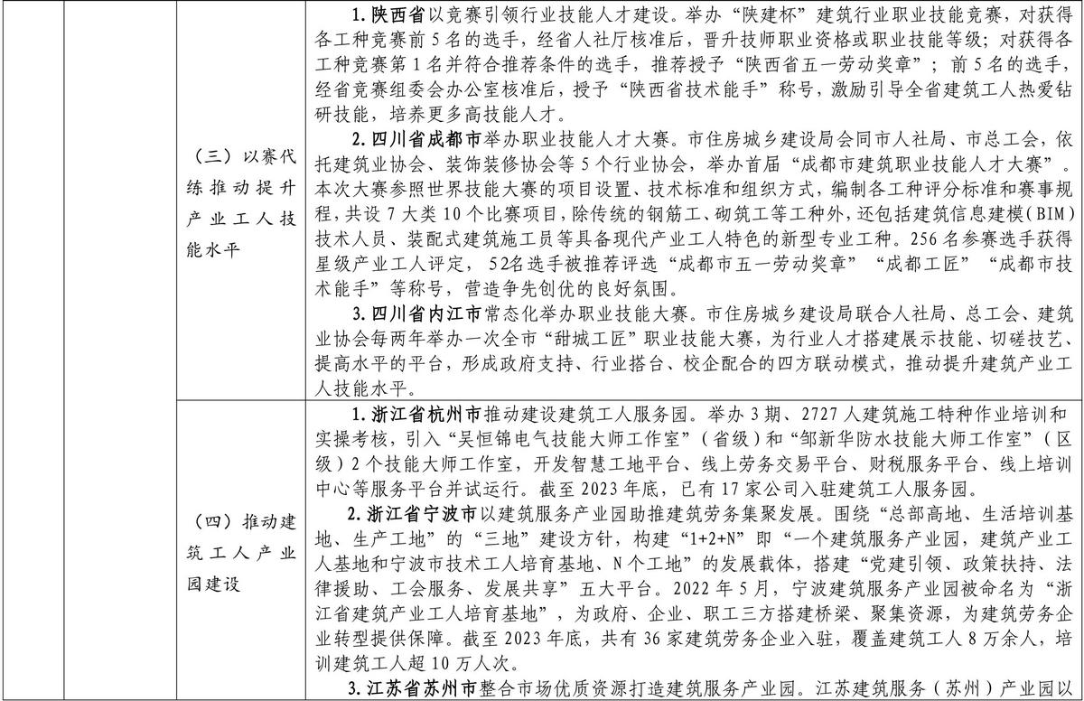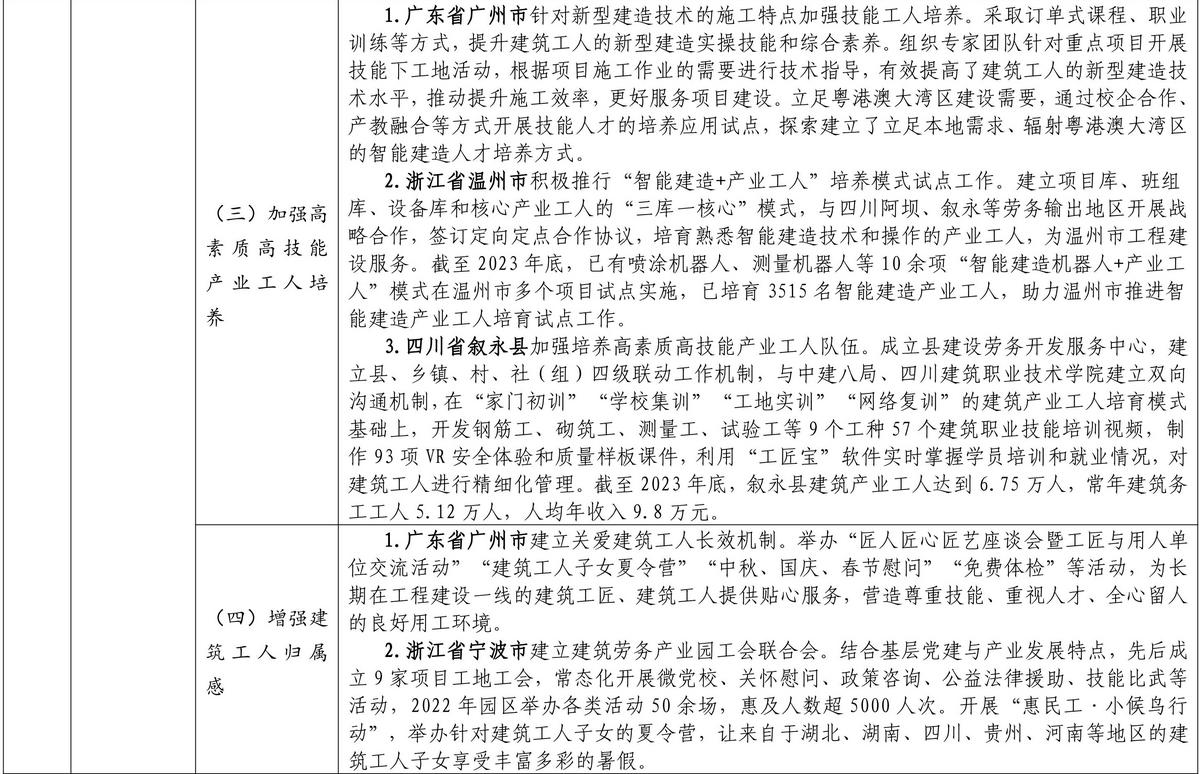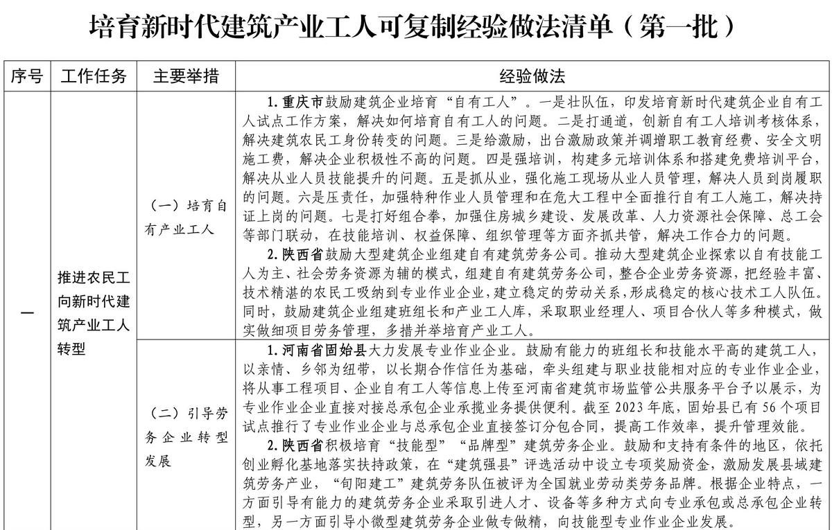 按照《住房和城鄉(xiāng)建設(shè)部等部門關(guān)于加快培育新時代建筑產(chǎn)業(yè)工人隊伍的指導(dǎo)意見》要求,各地圍繞推進(jìn)農(nóng)民工向新時代建筑產(chǎn)業(yè)工人轉(zhuǎn)型、完善建筑工人實名制管理、提升建筑工人技能水平、加強(qiáng)統(tǒng)籌協(xié)作和政策支持、保障建筑工人合法權(quán)益等方面,積極探索、大力推進(jìn)新時代建筑產(chǎn)業(yè)工人隊伍建設(shè),取得了積極成效。近日,住房和城鄉(xiāng)建設(shè)部印發(fā)培育新時代建筑產(chǎn)業(yè)工人可復(fù)制經(jīng)驗做法清單(第一批)。
