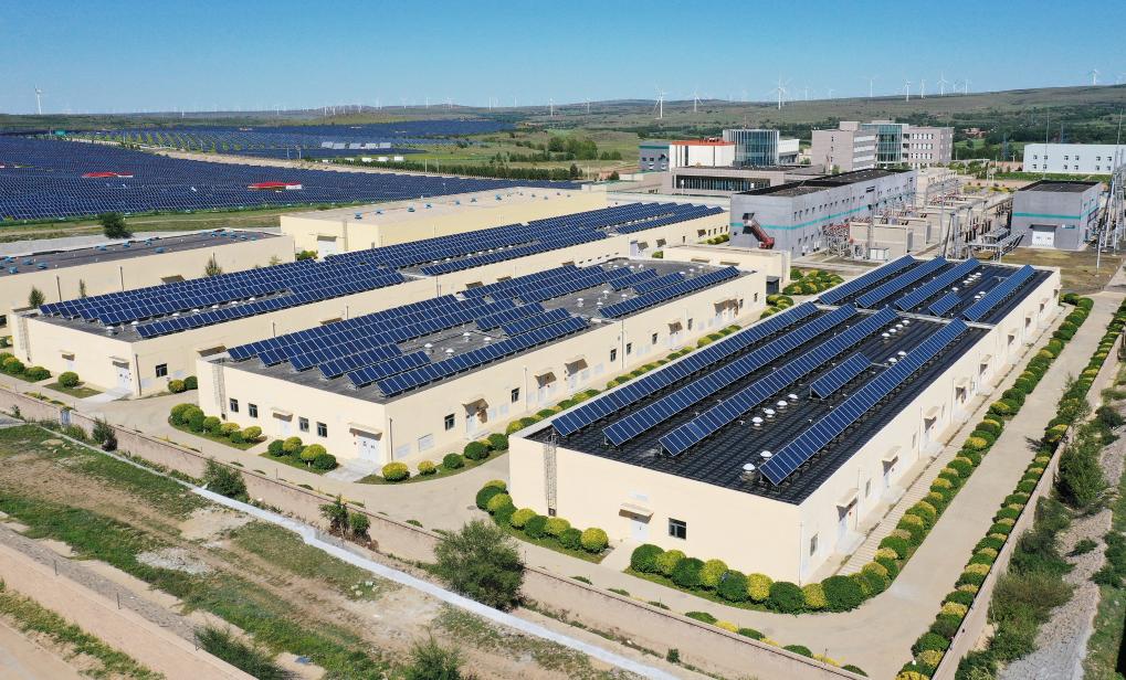 在河北張家口,國家風光儲輸示范工程內數(shù)排儲能廠房并列其中。(2023年8月18日攝,無人機照片)。新華社記者李賀 攝