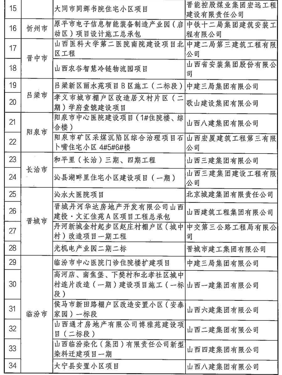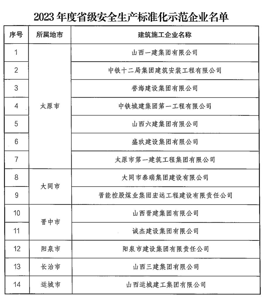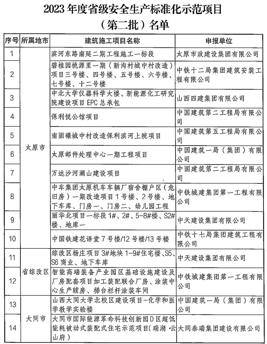 根據(jù)《山西省住房和城鄉(xiāng)建設(shè)廳建筑施工安全生產(chǎn)標(biāo)準(zhǔn)化創(chuàng)建和考評(píng)實(shí)施細(xì)則》,經(jīng)企業(yè)自主申報(bào),省廳組織專家資料審查、現(xiàn)場(chǎng)核查,評(píng)定山西一建集團(tuán)有限公司等14個(gè)企業(yè)為2023年度“省級(jí)安全生產(chǎn)標(biāo)準(zhǔn)化示范企業(yè)”,評(píng)定濱河?xùn)|路南延二期工程施工一標(biāo)段等38個(gè)項(xiàng)目為2023年度第二批“省級(jí)安全生產(chǎn)標(biāo)準(zhǔn)化示范項(xiàng)目”,且經(jīng)公示無異議,現(xiàn)將名單予以公布。