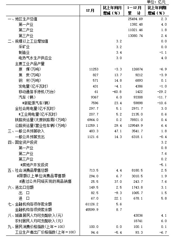 根據(jù)地區(qū)生產(chǎn)總值統(tǒng)一核算結(jié)果,全年全省地區(qū)生產(chǎn)總值為25494.69億元,按不變價(jià)格計(jì)算,比上年增長2.3%。其中,第一產(chǎn)業(yè)增加值為1392.48億元,增長4.0%;第二產(chǎn)業(yè)增加值為11021.46億元,增長1.8%;第三產(chǎn)業(yè)增加值為13080.74億元,增長2.4%。