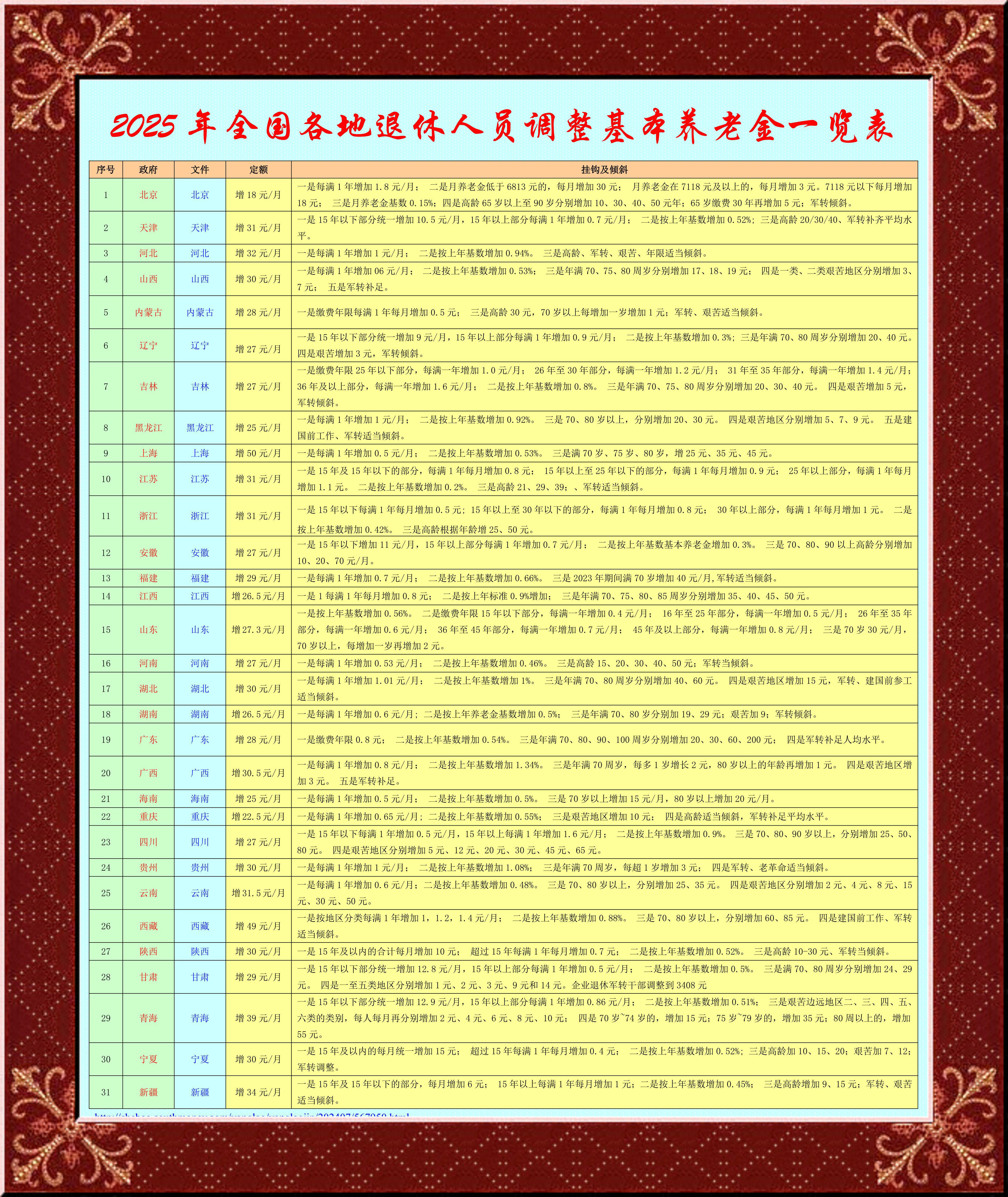 【人力資源】2025年全國(guó)各地退休人員調(diào)整基本養(yǎng)老金一覽表