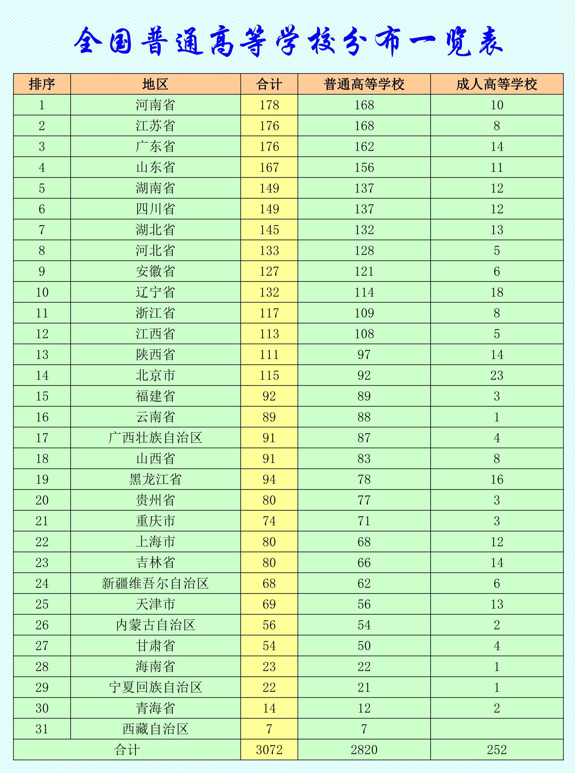 截至2023年6月15日,全國高等學(xué)校共計(jì)3072所,其中:普通高等學(xué)校2820所,含本科院校1275所、高職(??疲┰盒?545所;成人高等學(xué)校252所。本名單未包含港澳臺(tái)地區(qū)高等學(xué)校。