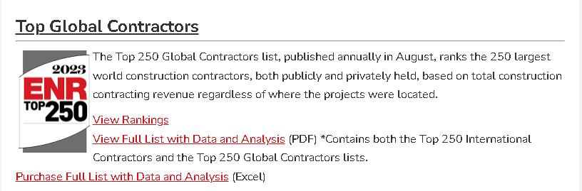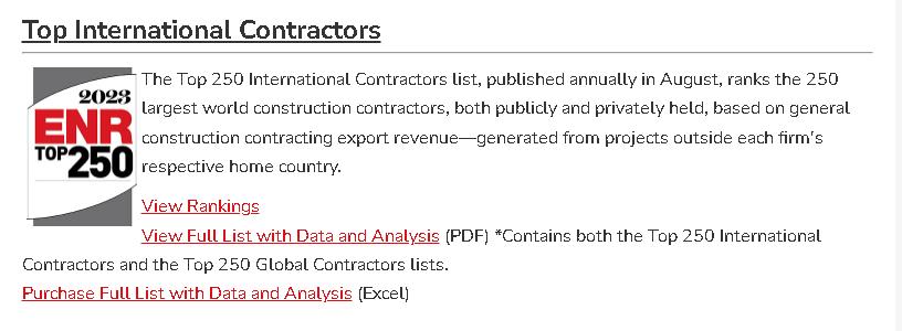 查看完整列表的數(shù)據(jù)和分析(PDF) *包含國(guó)際承包商250強(qiáng)和全球250強(qiáng)承包商名單。