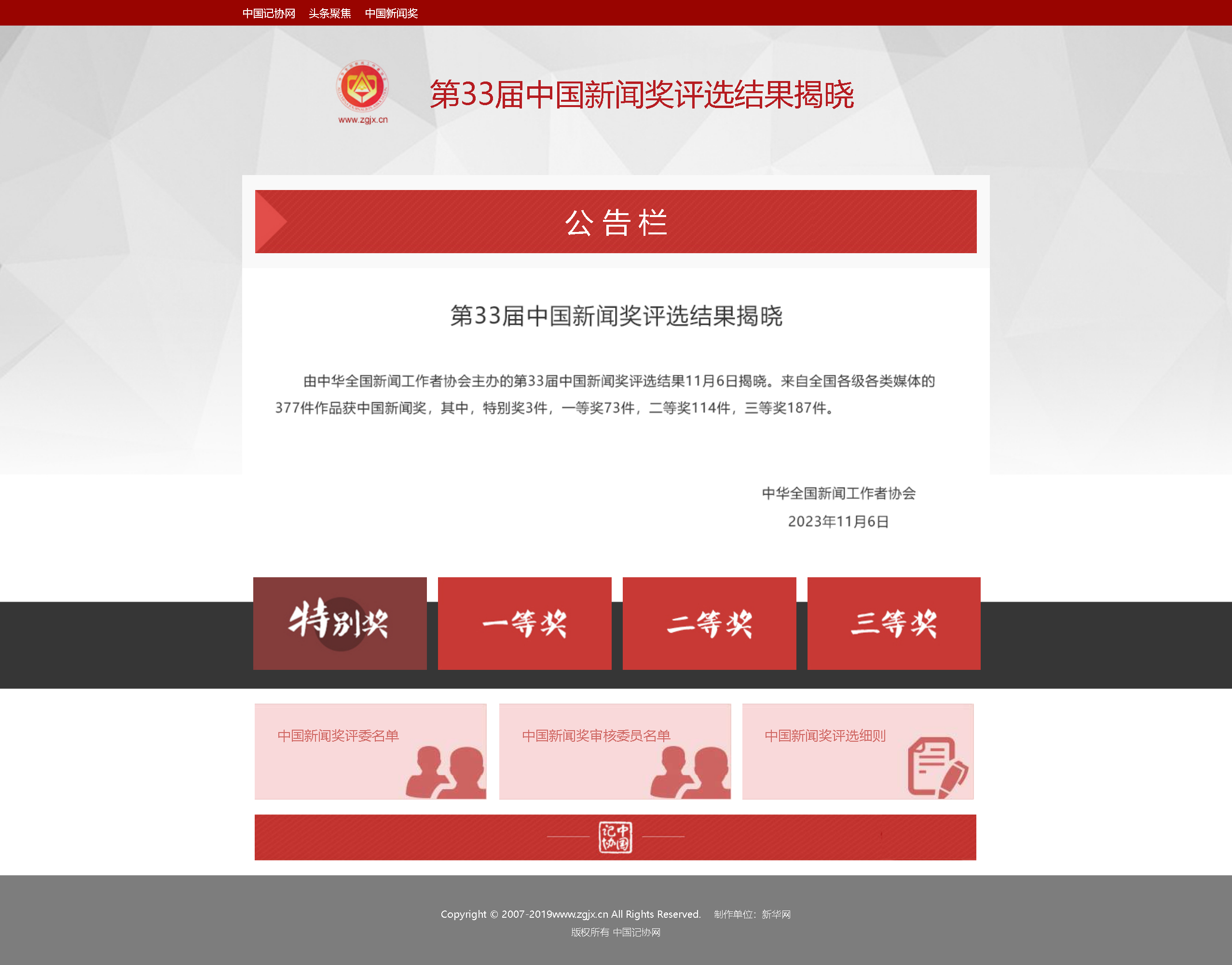 新華社北京11月6日電 由中華全國新聞工作者協(xié)會主辦的第33屆中國新聞獎評選結(jié)果11月6日揭曉。來自全國各級各類媒體的377件作品獲中國新聞獎,其中,特別獎3件,一等獎73件,二等獎114件,三等獎187件。