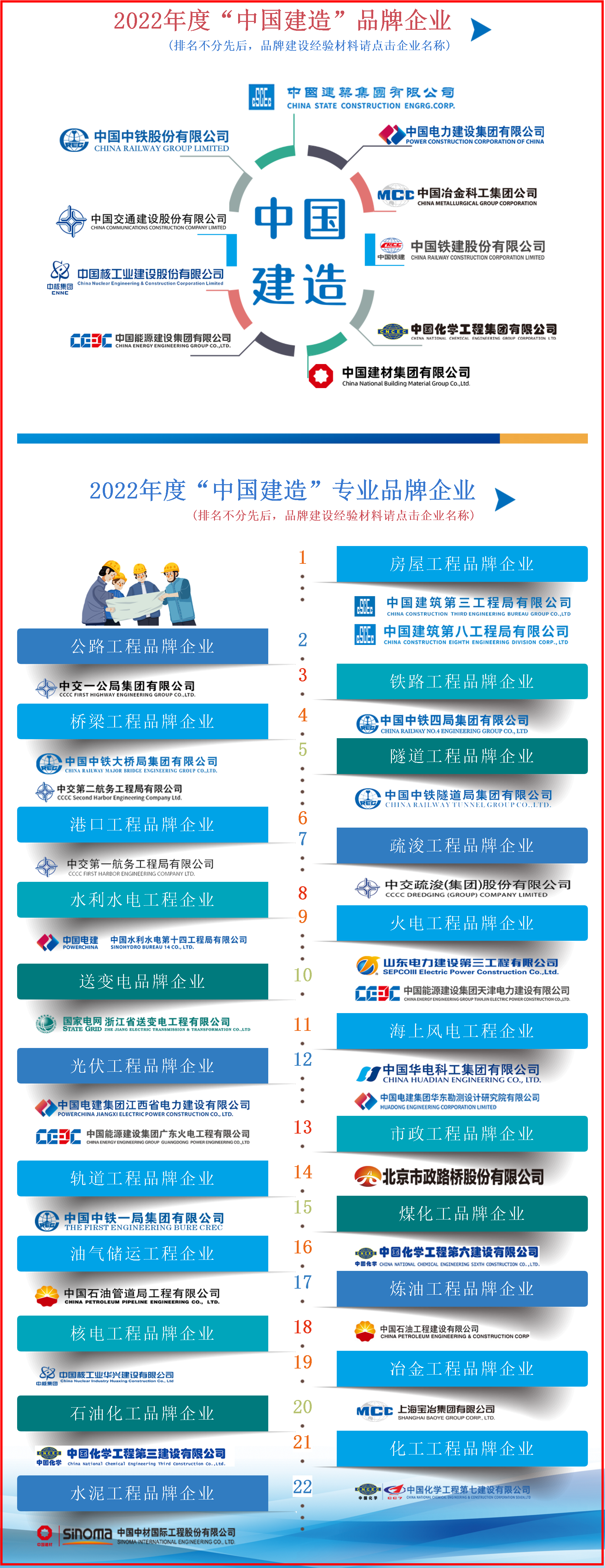 中國(guó)施工企業(yè)管理協(xié)會(huì)深入踐行新時(shí)代品牌強(qiáng)國(guó)戰(zhàn)略,在第6個(gè)中國(guó)品牌日到來之際,組織開展了一系列工程建設(shè)企業(yè)品牌建設(shè)宣傳活動(dòng)。5月5日,專門下發(fā)《關(guān)于加強(qiáng)工程建設(shè)企業(yè)品牌建設(shè)的指導(dǎo)意見》,5月9日,下發(fā)《關(guān)于開展工程建設(shè)企業(yè)品牌建設(shè)宣傳活動(dòng)的通知》,著力提升工程建設(shè)企業(yè)品牌建設(shè)能力。 協(xié)會(huì)結(jié)合行業(yè)實(shí)際,重點(diǎn)在房屋工程、公路工程、鐵路工程、橋梁工程、隧道工程、港口工程、疏浚工程、水利水電工程、火電工程、送變電工程、海上風(fēng)電工程、光伏工程、市政工程、軌道工程、煤化工工程、油氣儲(chǔ)運(yùn)工程、煉油工程、核電工程、冶金工程、石油化工工程、化工工程、水泥工程等領(lǐng)域,遴選一批在品牌建設(shè)上具有代表性、先進(jìn)性、引領(lǐng)性的專業(yè)品牌企業(yè),將其經(jīng)驗(yàn)做法在協(xié)會(huì)官網(wǎng)設(shè)置“中國(guó)建造品牌宣傳”專欄刊發(fā),供全行業(yè)學(xué)習(xí)借鑒。