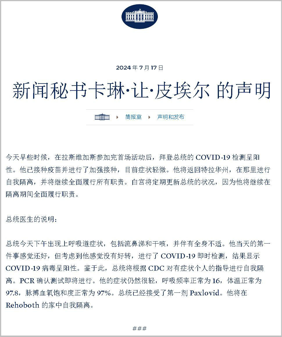新華社美國密爾沃基7月17日電(記者熊茂伶)白宮17日發(fā)表聲明說,美國總統(tǒng)拜登當(dāng)天新冠病毒檢測(cè)呈陽性,有輕微癥狀。