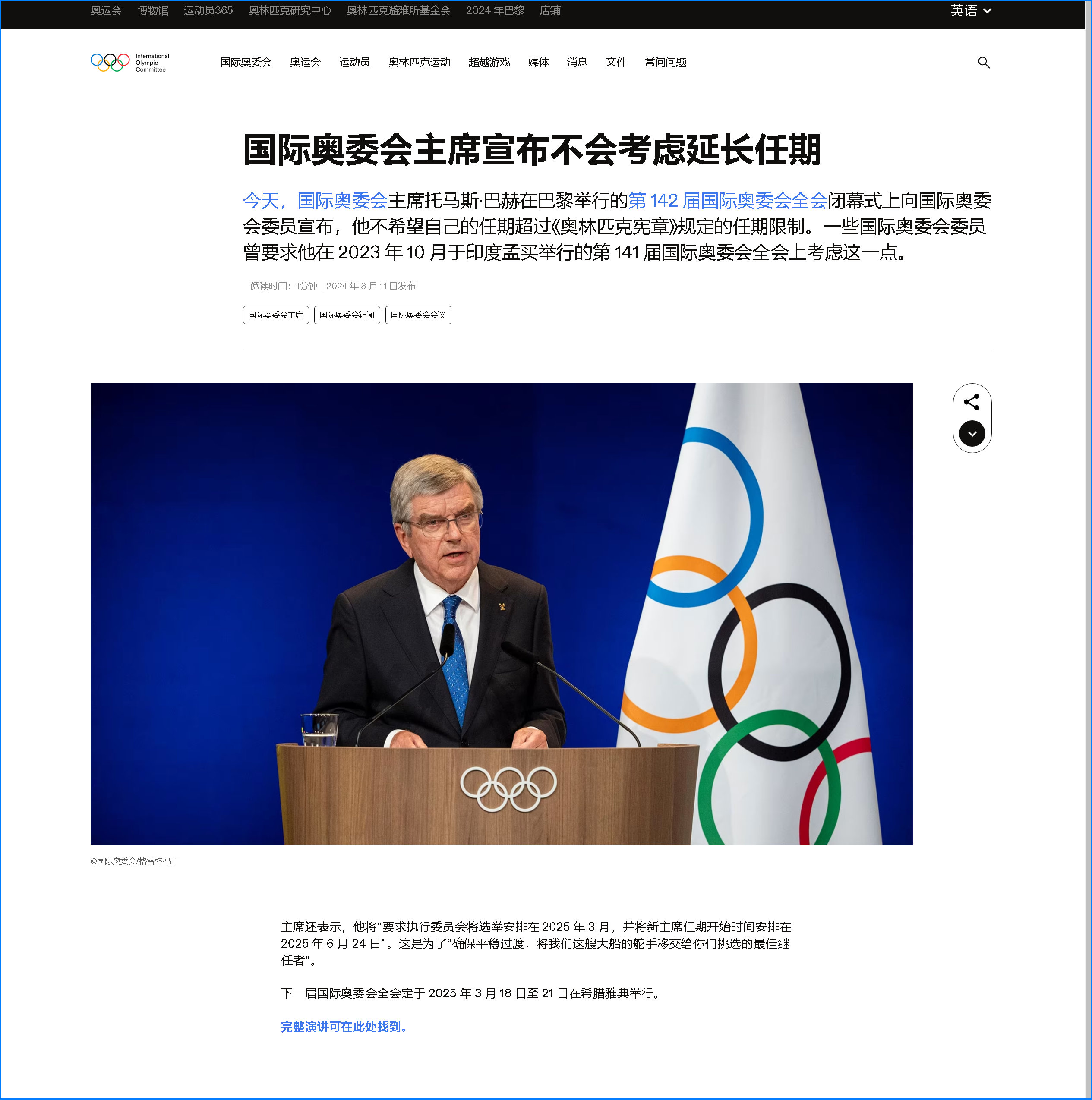 北京時(shí)間8月11日,國(guó)際奧委會(huì)第145屆會(huì)議上,現(xiàn)任國(guó)際奧委會(huì)主席巴赫宣布將不再連任。