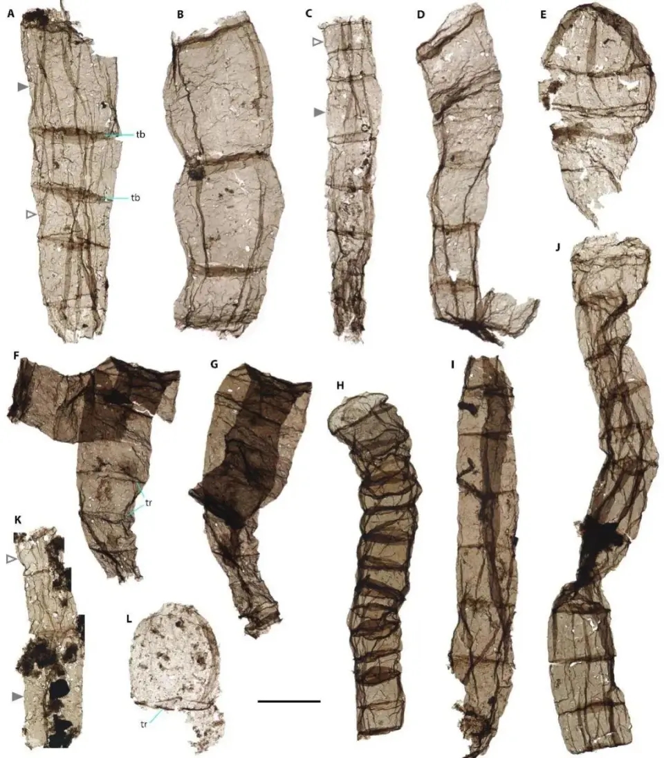 ▲串嶺溝組中發(fā)現(xiàn)的壯麗青山藻?;4鏋橛袡C(jī)質(zhì)壁構(gòu)成的多細(xì)胞絲狀體,顯示細(xì)胞大小和形態(tài)的變化引起的絲狀體形態(tài)變化。絲狀體直徑向一端收縮(A-D、F-I、K),絲狀體直徑不變(J),保存有完整端部的絲狀體(E、L)。比例尺對于F-H和K代表100微米,其余的代表50微米。