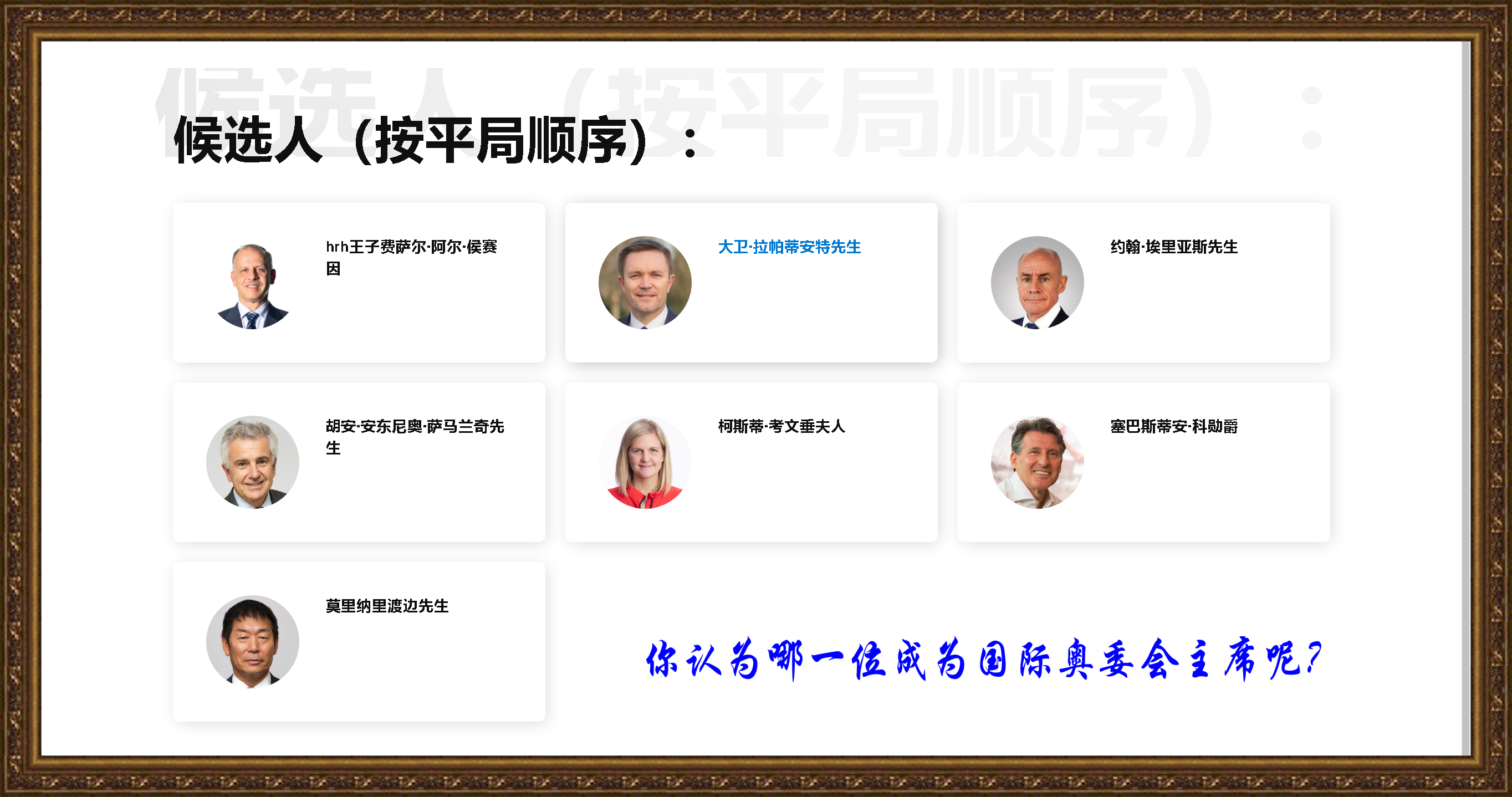 在國(guó)際奧委會(huì)近131年的歷史上,一共產(chǎn)生過九位主席,其中八人來自歐洲,另外一位來自美國(guó)。根據(jù)《奧林匹克憲章》,主席候選人必須是現(xiàn)任國(guó)際奧委會(huì)委員。本次參與競(jìng)選的共有七人,其中歐洲四人,分別是國(guó)際奧委會(huì)副主席小薩馬蘭奇(65歲,西班牙)、世界田聯(lián)主席塞巴斯蒂安·科(68歲,英國(guó))、國(guó)際自行車聯(lián)盟主席大衛(wèi)·拉帕爾蒂安(51歲,法國(guó))和國(guó)際雪聯(lián)主席約翰·埃利亞施(63歲,瑞典和英國(guó)雙重國(guó)籍);亞洲兩人,分別是國(guó)際奧委會(huì)執(zhí)委費(fèi)薩爾·侯賽因(61歲,約旦)和國(guó)際體操聯(lián)合會(huì)主席渡邊守成(66歲,日本);非洲一人,國(guó)際奧委會(huì)執(zhí)委、運(yùn)動(dòng)員委員會(huì)前主席柯絲蒂·考文垂(41歲,津巴布韋)。