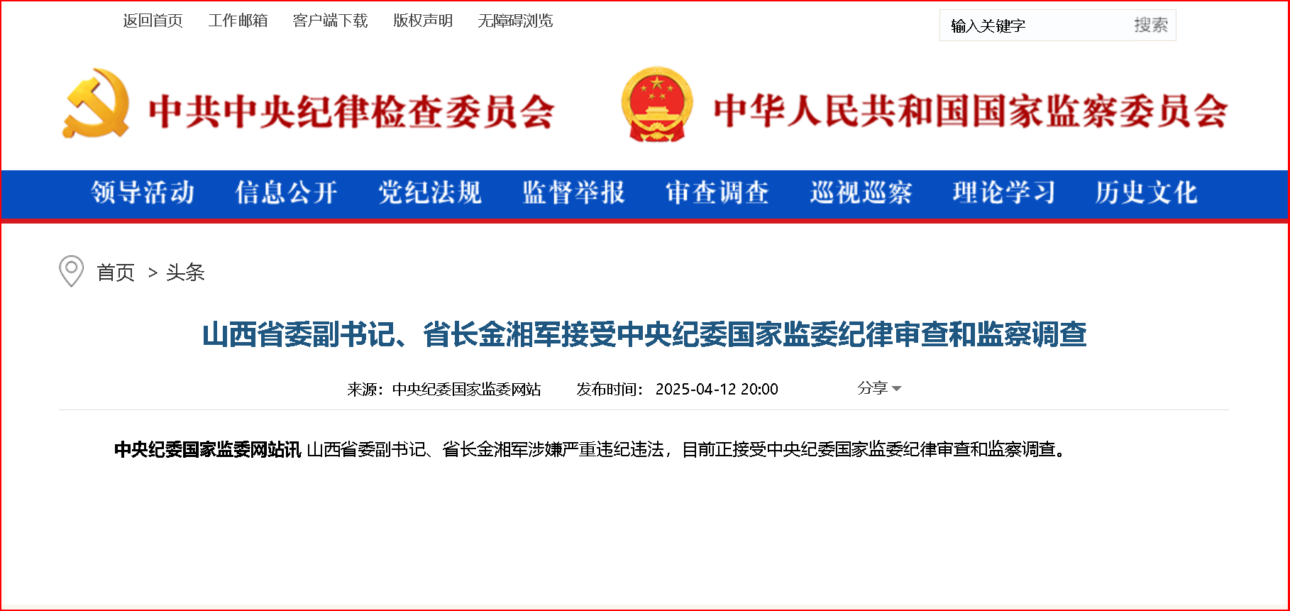 據(jù)中央紀(jì)委國(guó)家監(jiān)委網(wǎng)站4月12日消息,山西省委副書(shū)記、省長(zhǎng)金湘軍涉嫌嚴(yán)重違紀(jì)違法,目前正接受中央紀(jì)委國(guó)家監(jiān)委紀(jì)律審查和監(jiān)察調(diào)查。