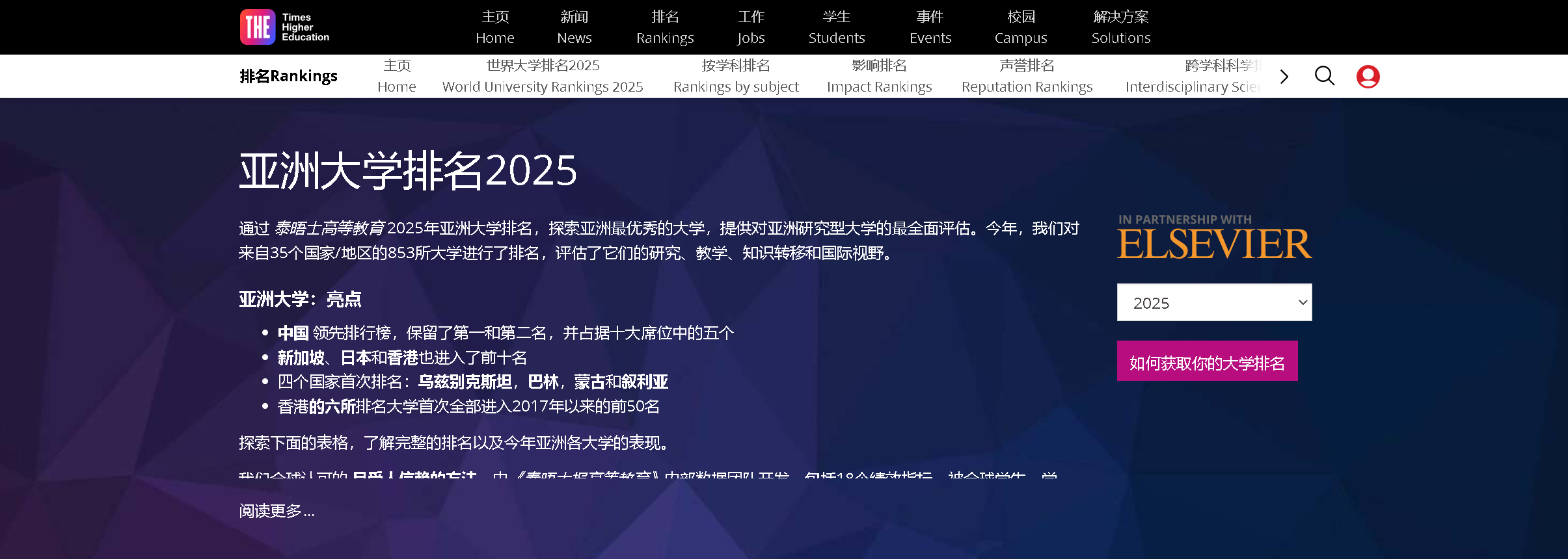 英國(guó)泰晤士高等教育2025年亞洲大學(xué)排名,共有來(lái)自35個(gè)國(guó)家或地區(qū)的853所大學(xué)上榜,評(píng)審指標(biāo)包括“產(chǎn)業(yè)”“國(guó)際展望”“研究質(zhì)量”“研究環(huán)境”和“教學(xué)”等。