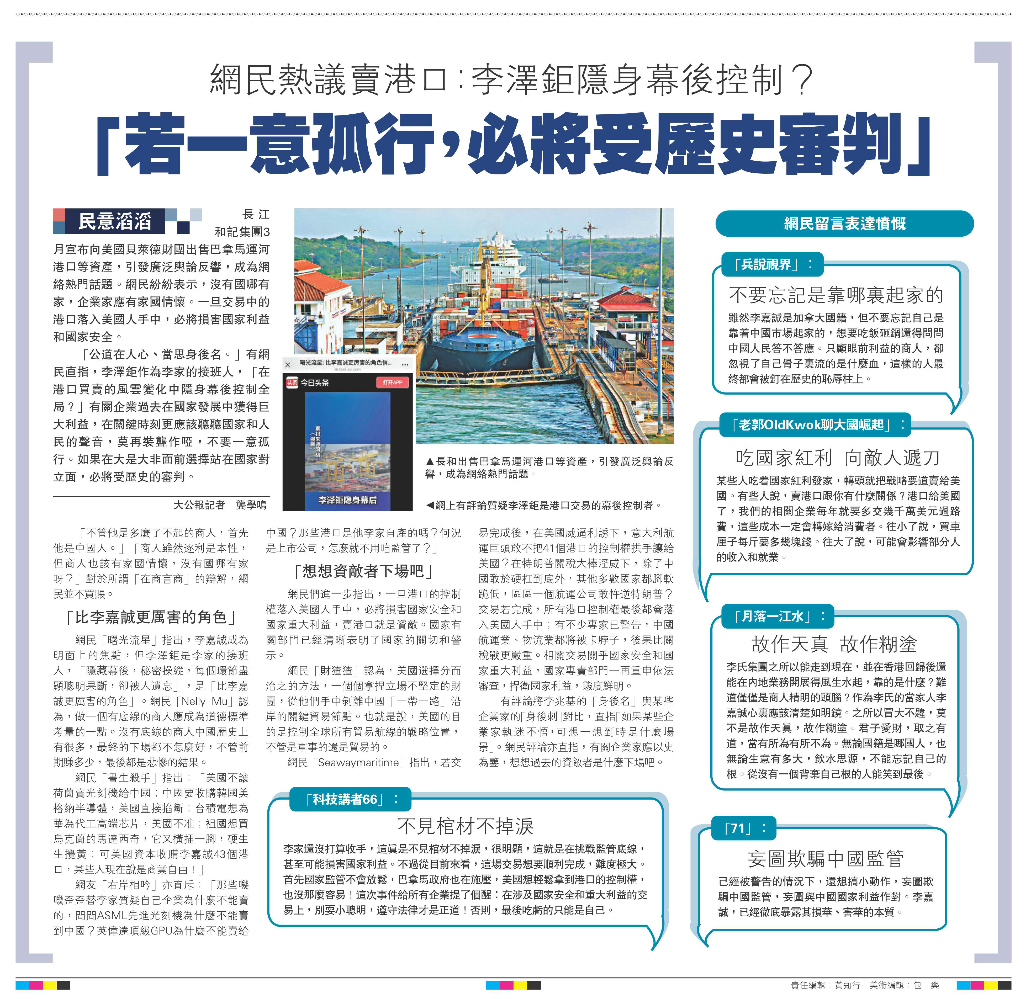 「公道在人心、當(dāng)思身后名?!褂芯W(wǎng)民直指,李澤巨作為李家的接班人,「在港口買賣的風(fēng)云變化中隱身幕后控制全局?」有關(guān)企業(yè)過去在國家發(fā)展中獲得巨大利益,在關(guān)鍵時(shí)刻更應(yīng)該聽聽國家和人民的聲音,莫再裝聾作啞,不要一意孤行。如果在大是大非面前選擇站在國家對(duì)立面,必將受歷史的審判。 \大公報(bào)記者龔學(xué)鳴