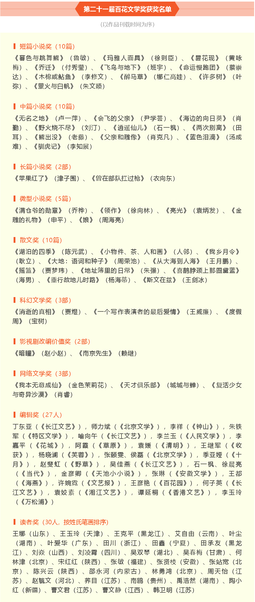經(jīng)過(guò)讀者線上線下投票和專家評(píng)審,共評(píng)選出短篇小說(shuō)獎(jiǎng)10篇,中篇小說(shuō)獎(jiǎng)10篇,長(zhǎng)篇小說(shuō)獎(jiǎng)2篇,微型小說(shuō)獎(jiǎng)5篇,影視劇改編價(jià)值獎(jiǎng)2篇,散文獎(jiǎng)10篇,科幻文學(xué)獎(jiǎng)3篇,網(wǎng)絡(luò)文學(xué)獎(jiǎng)3篇。