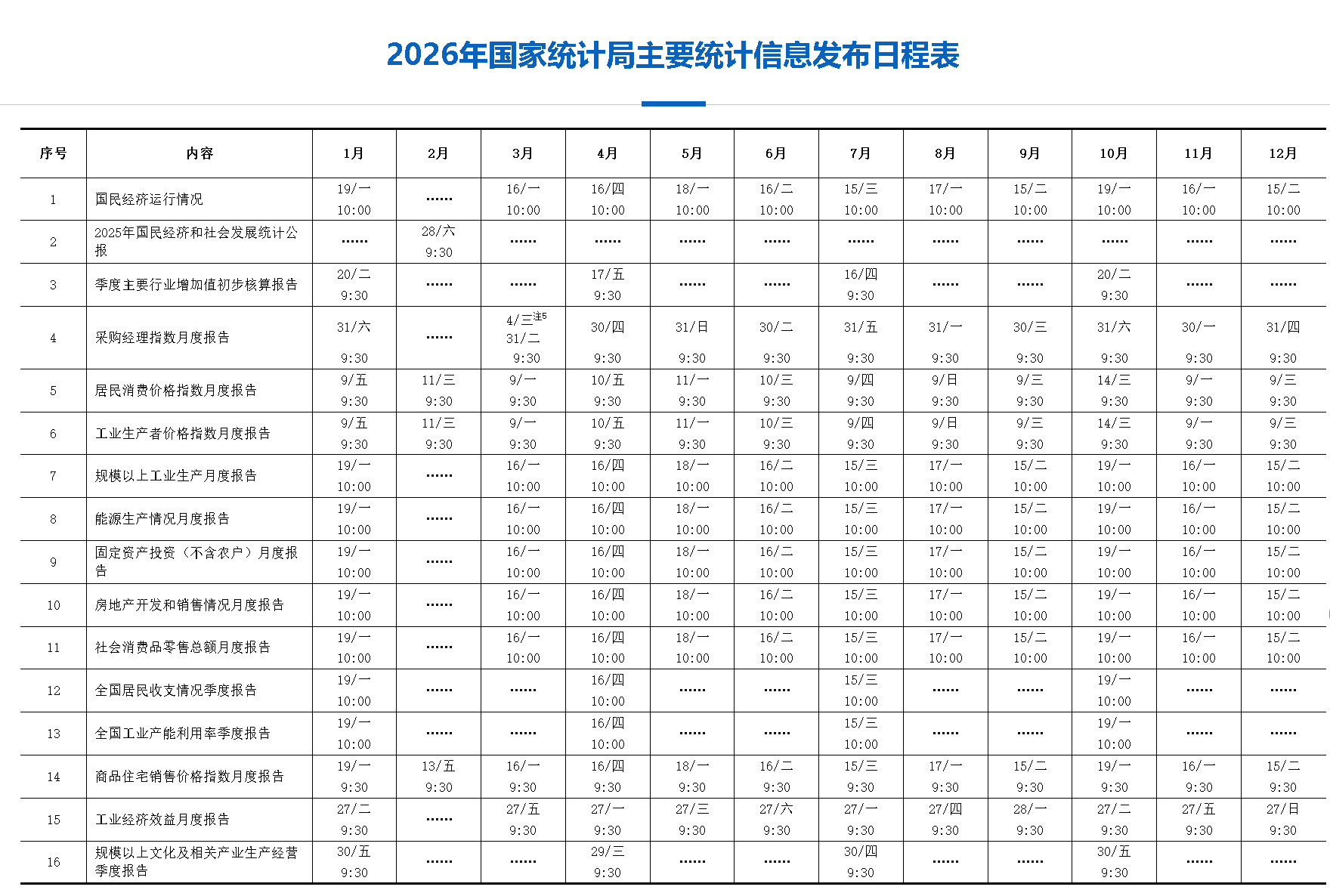 2025年國(guó)家統(tǒng)計(jì)局主要統(tǒng)計(jì)信息發(fā)布日程表2024-12-30