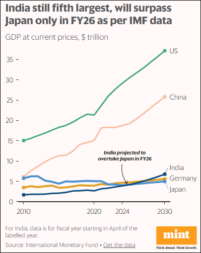 根據(jù)IMF的預(yù)測,印度目前其實仍為世界第五大經(jīng)濟(jì)體,超越日本可能要到2026財年實現(xiàn)。 MINT