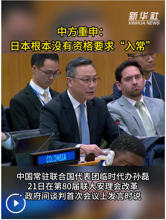 新華社聯(lián)合國1月21日電 中國常駐聯(lián)合國代表團臨時代辦孫磊21日在第80屆聯(lián)大安理會改革政府間談判首次會議上發(fā)言時說,日本無法承擔(dān)維護國際和平與安全的職責(zé),無法取信于國際社會,根本沒有資格要求成為安理會常任理事國。