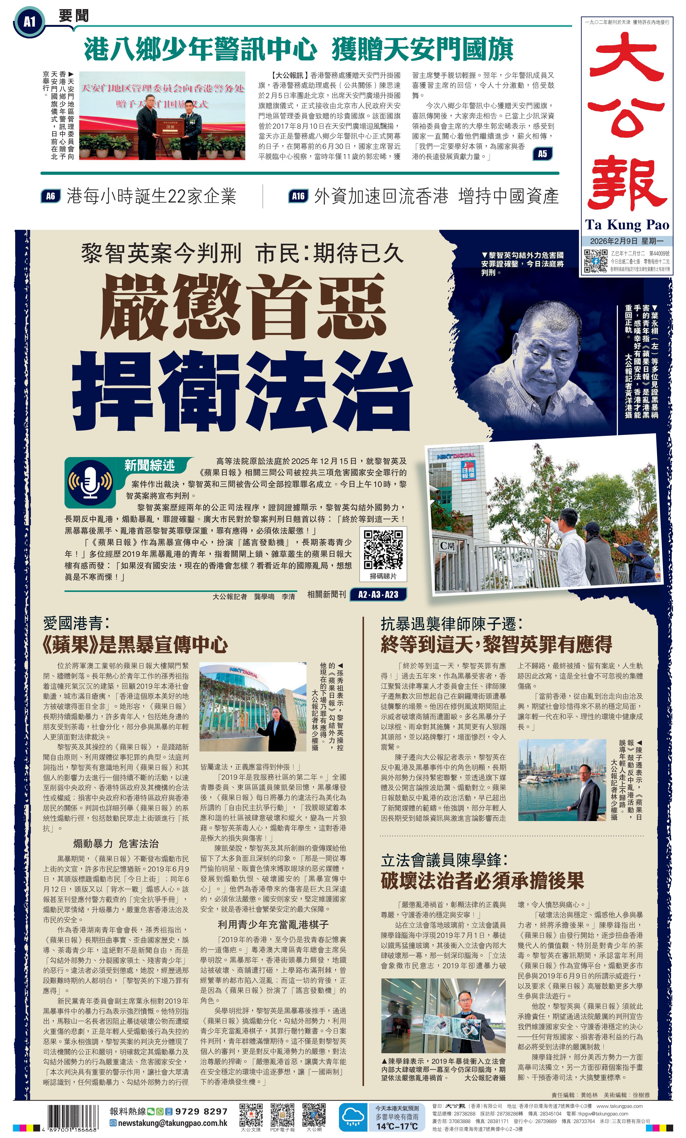 2025年12月15日,香港特區(qū)高等法院裁決,黎智英兩項(xiàng)串謀勾結(jié)外國(guó)勢(shì)力罪及一項(xiàng)串謀發(fā)布煽動(dòng)刊物罪成立。黎智英案被告求情于2026年1月12日開庭處理,13日處理完成。