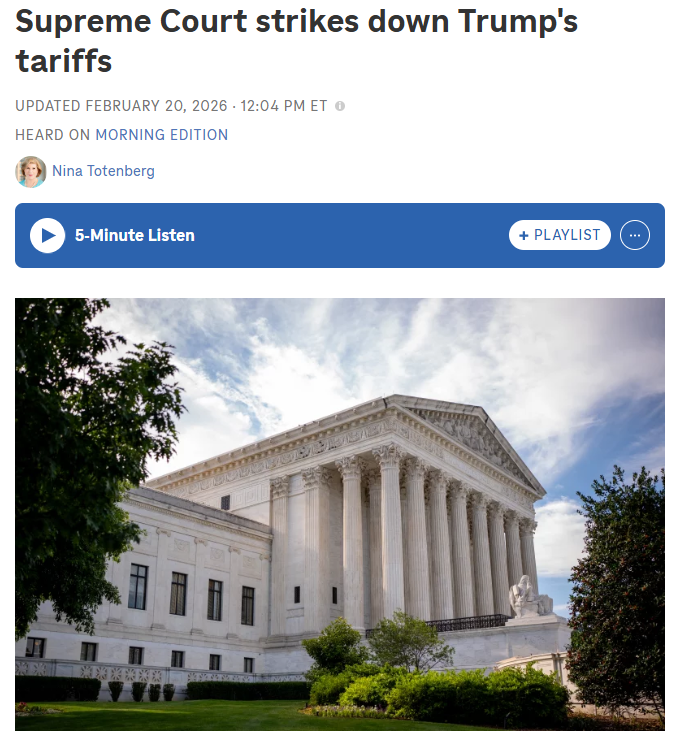 美國最高法院裁定特朗普政府大規(guī)模關稅政策違法 NPR報道截圖