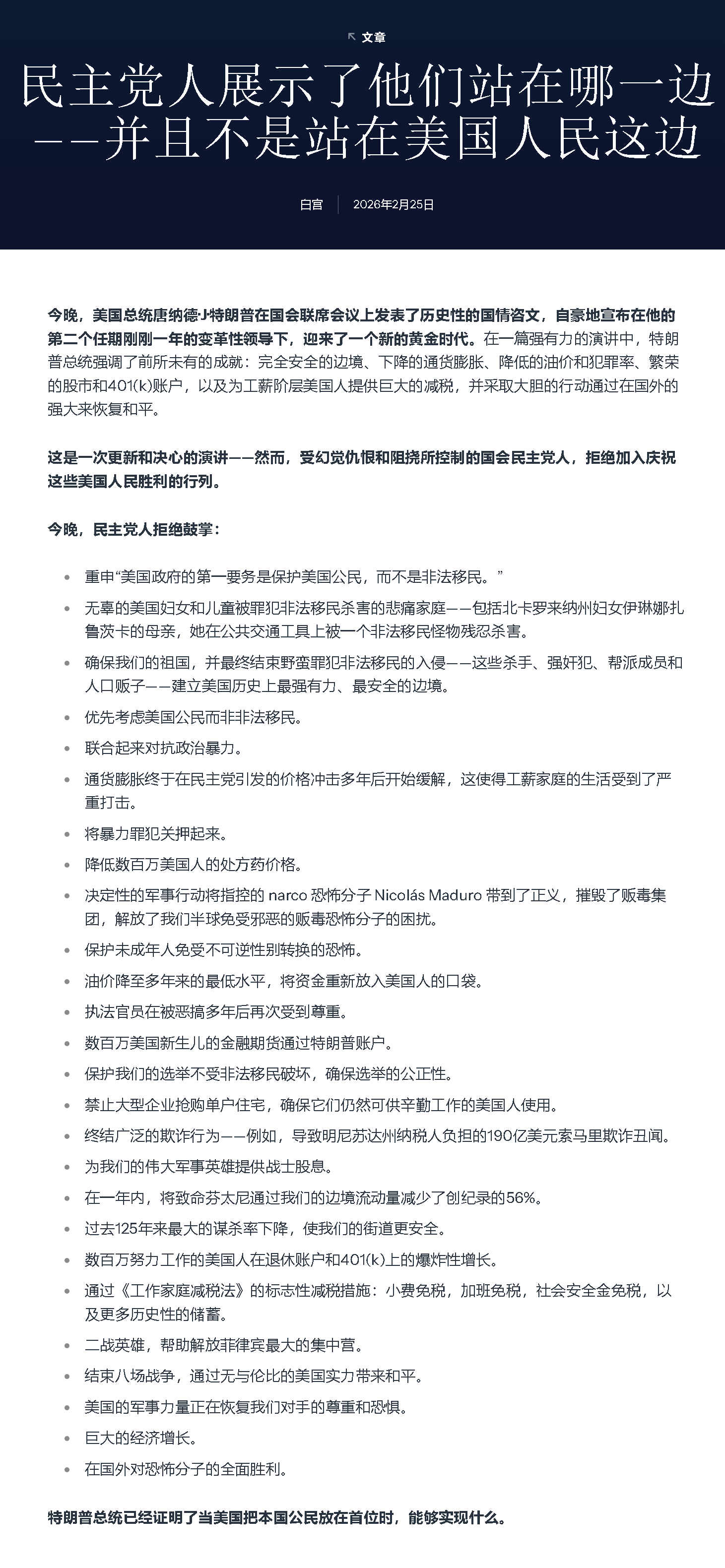 說完,共和黨起立歡呼鼓掌,民主黨人則都在靜坐。